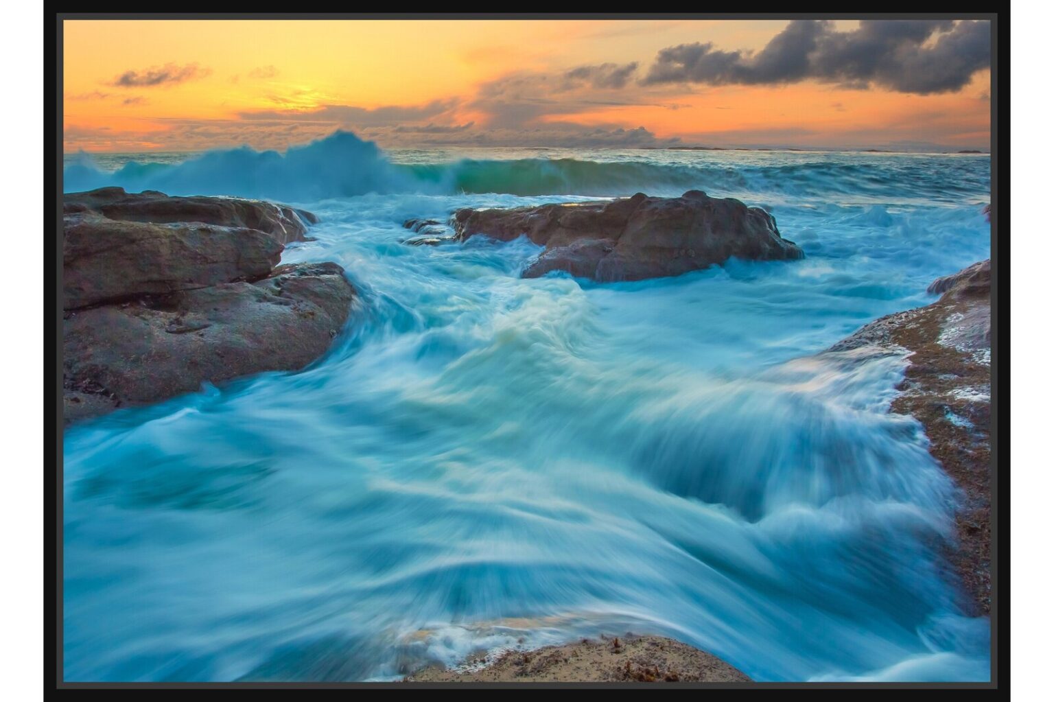 Морски вълни и скали при залез