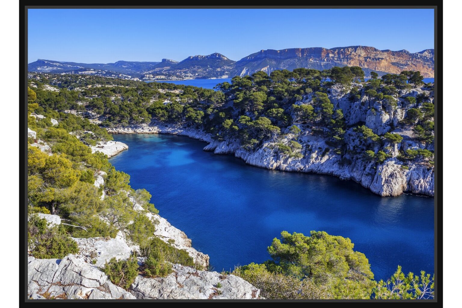 Фотография на морски залив с кристално синя вода и скалисти брегове, покрити със зелена растителност. Заливът е ограден от планини и носи усещане за свобода и свежест.