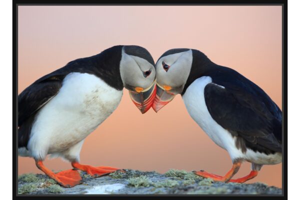Вълнуваща фотография на два пуфина, които се докосват с клюнове, създавайки усещане за нежност и връзка. Меките цветове на фона и ярките детайли подчертават уникалната красота на тези морски птици.