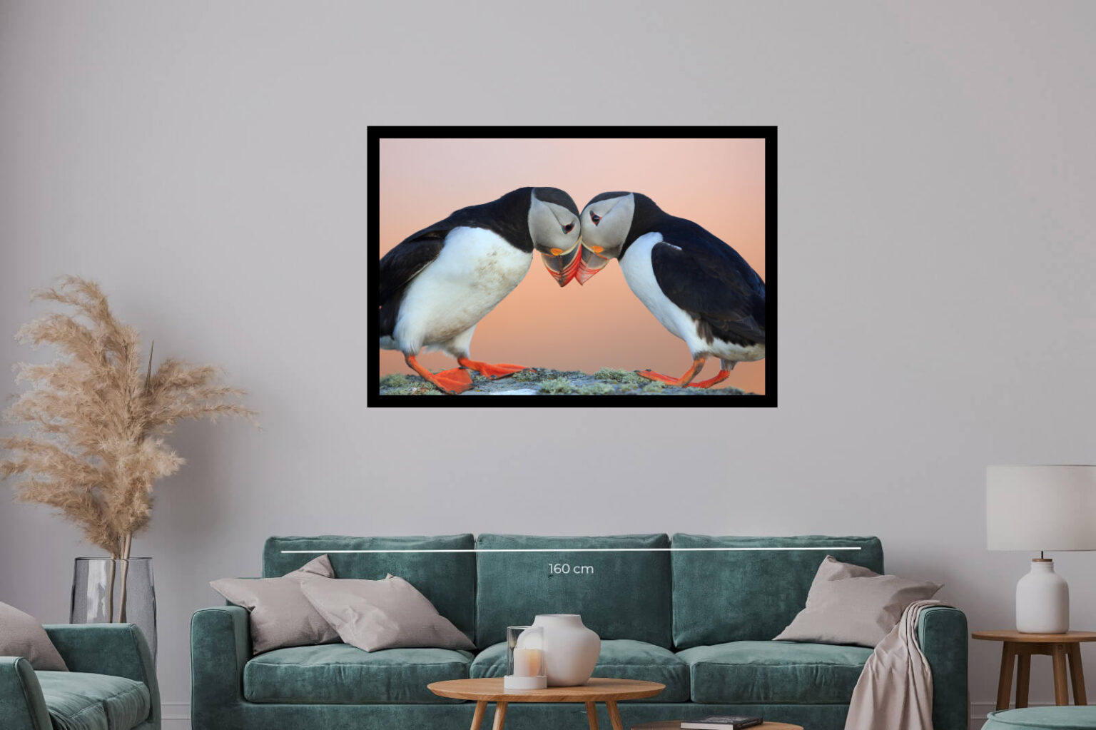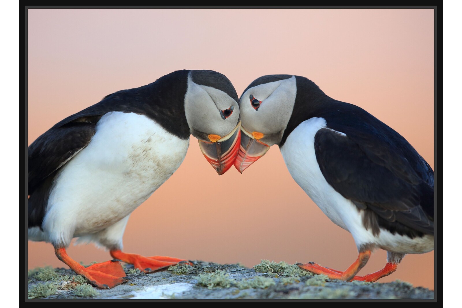 Два пуфина докосват клюнове на мек фон