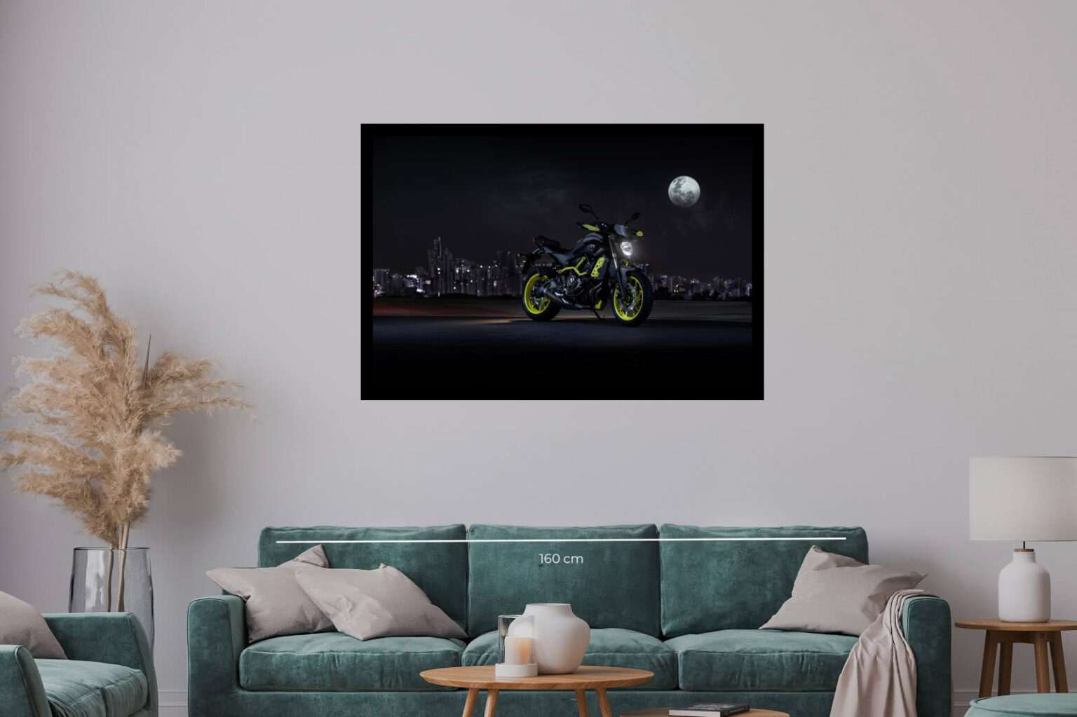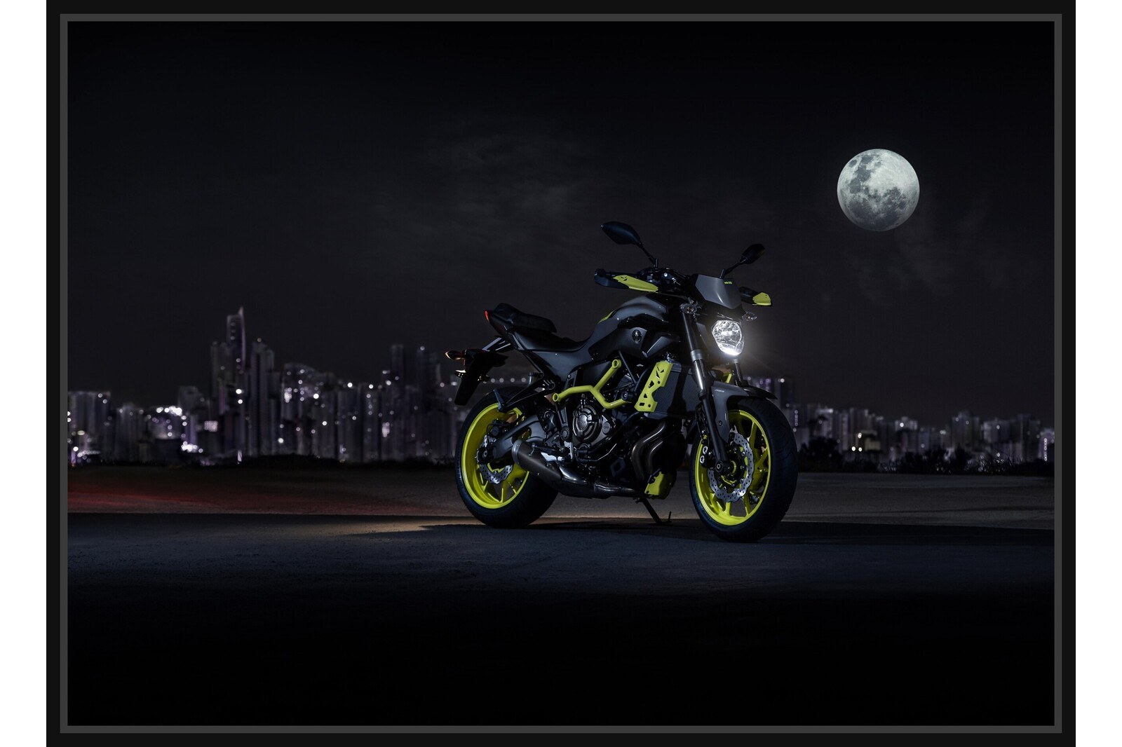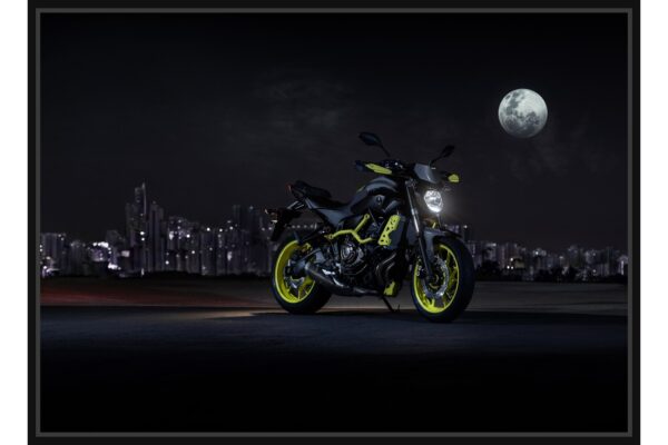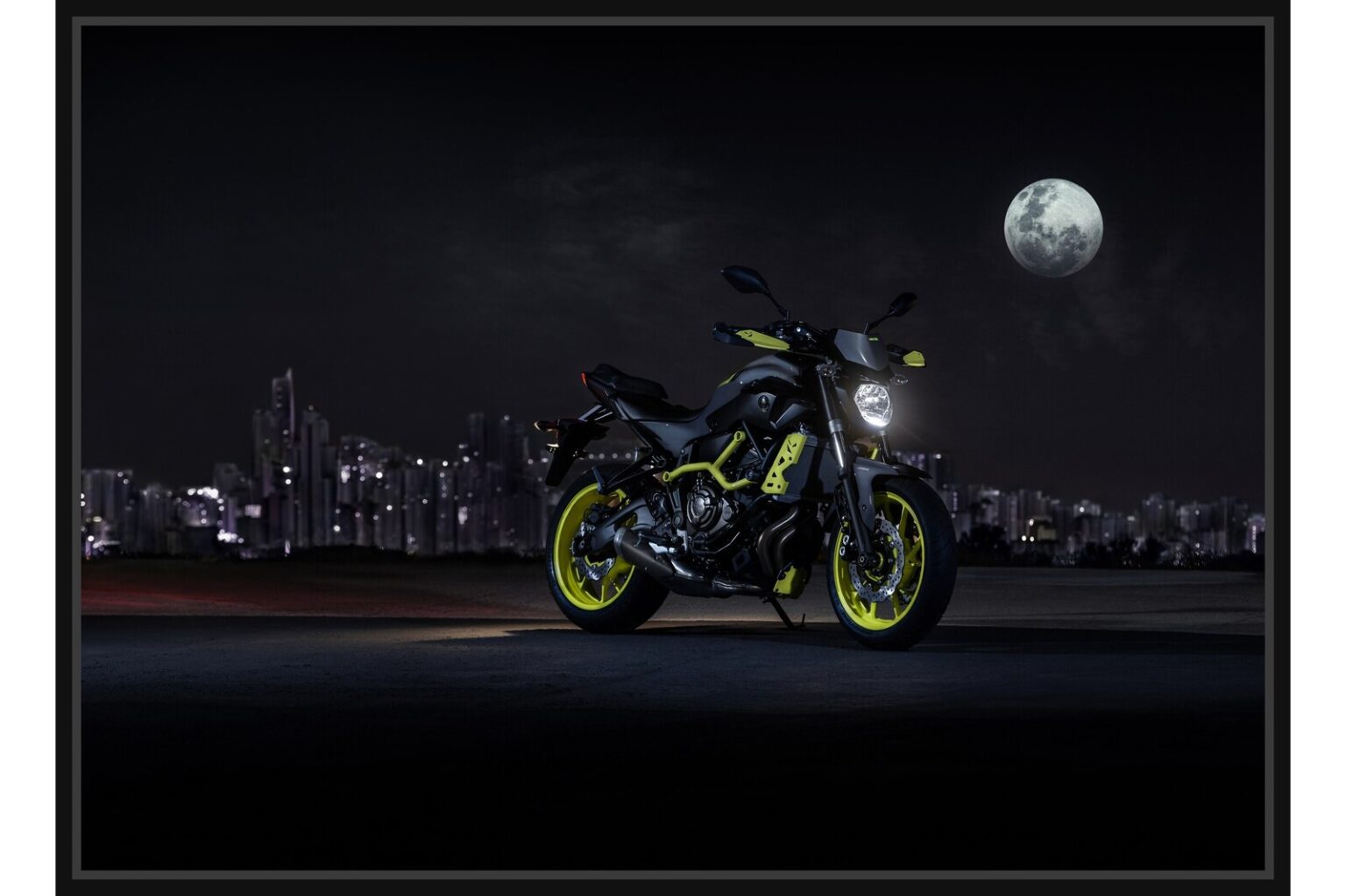 Ярък мотоциклет Yamaha MT под лунна светлина.