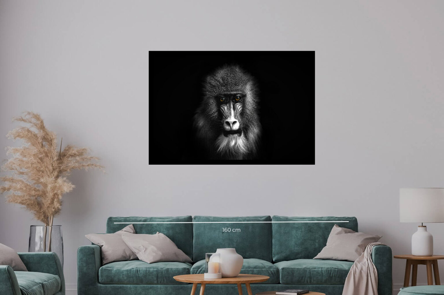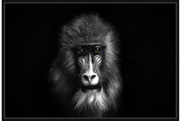 Черно-бял портрет на павиан с драматични светлосенки, акцентиращи върху очите и лицето му. Изображението внушава сила, интелект и мистериозност, улавяйки характера на животното.