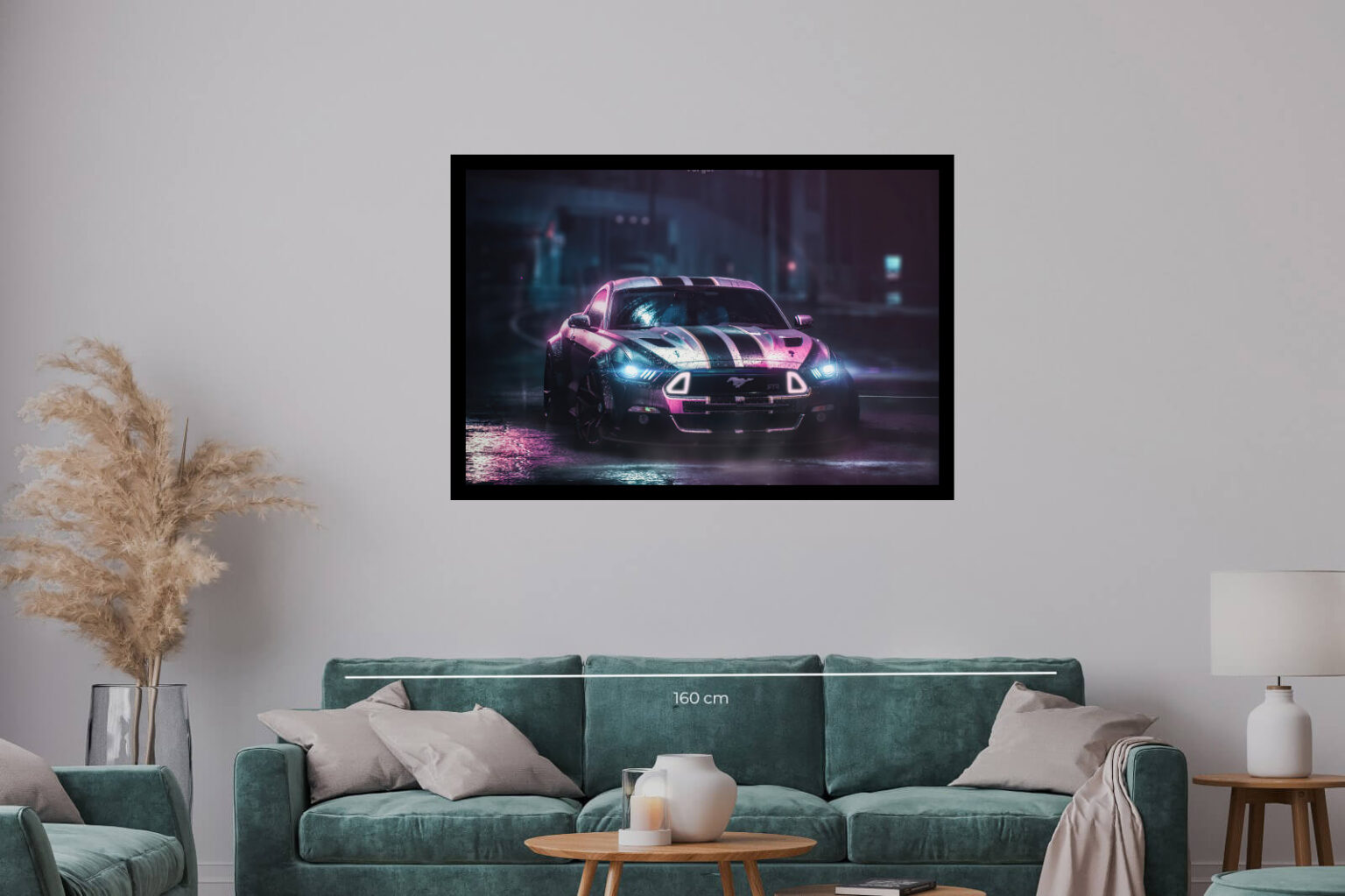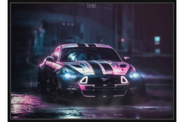 Мощен Ford Mustang в нощен градски пейзаж с неоново осветление. Съвременна визия на легендарния автомобил, която съчетава мощ, стил и модерна атмосфера.