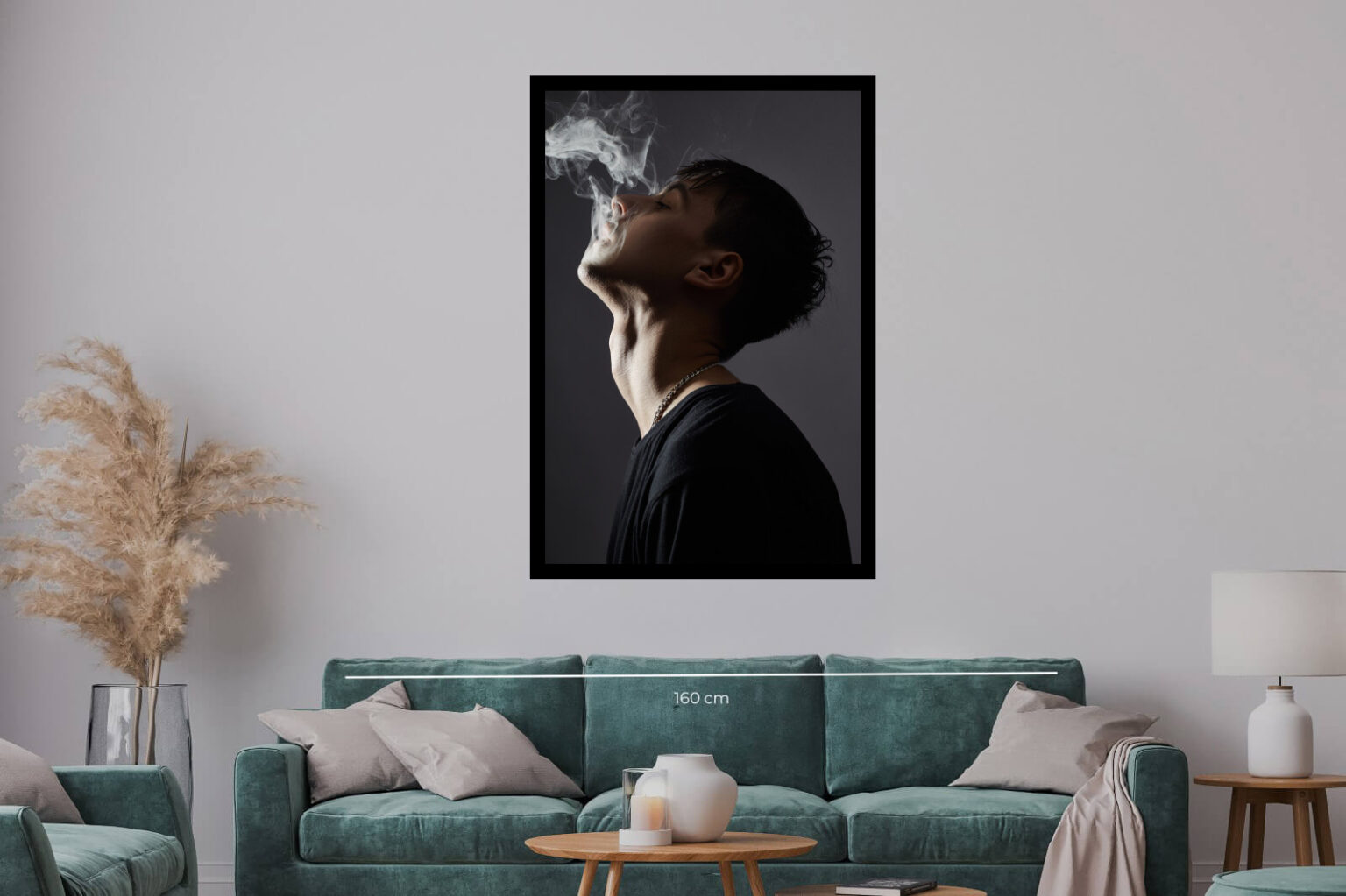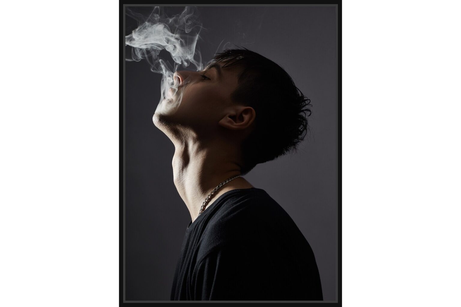 Художествен черно-бял портрет на мъж в профил, изпускащ дим. Силно драматичен контраст и минималистична визия.