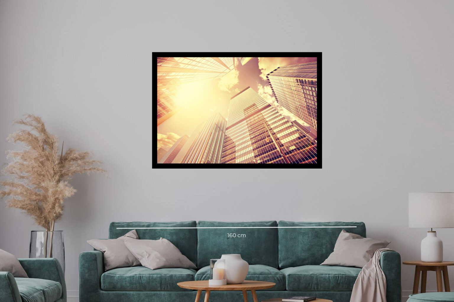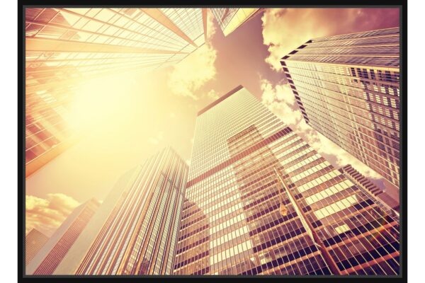 Модерна градска фотография, заснета от нисък ъгъл, показваща небостъргачи в златната светлина на залязващото слънце. Отразените лъчи по стъклените фасади създават динамична визия.