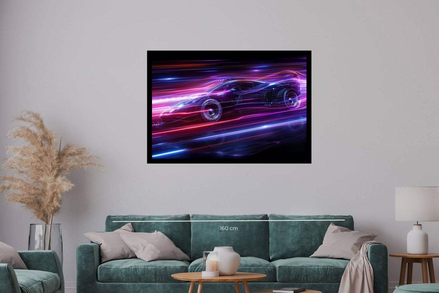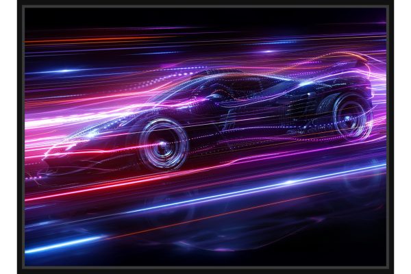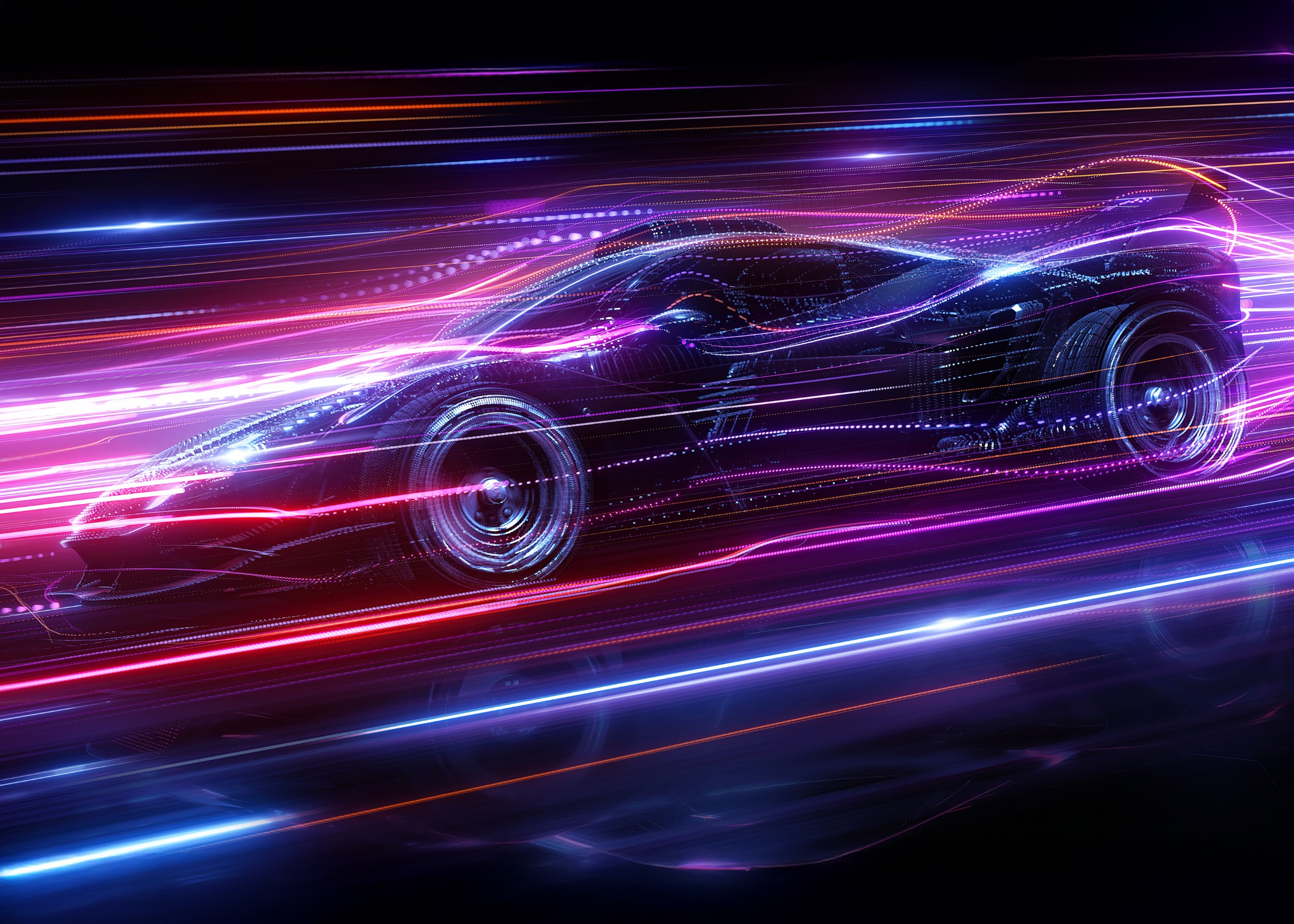 Енергична фотография на спортен автомобил, обграден от ярки линии светлина. Снимката е динамична и носи футуристично усещане за скорост.
