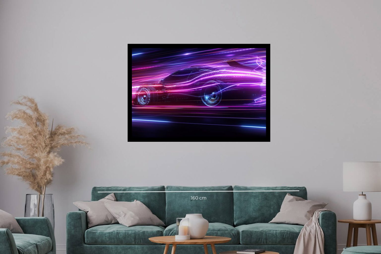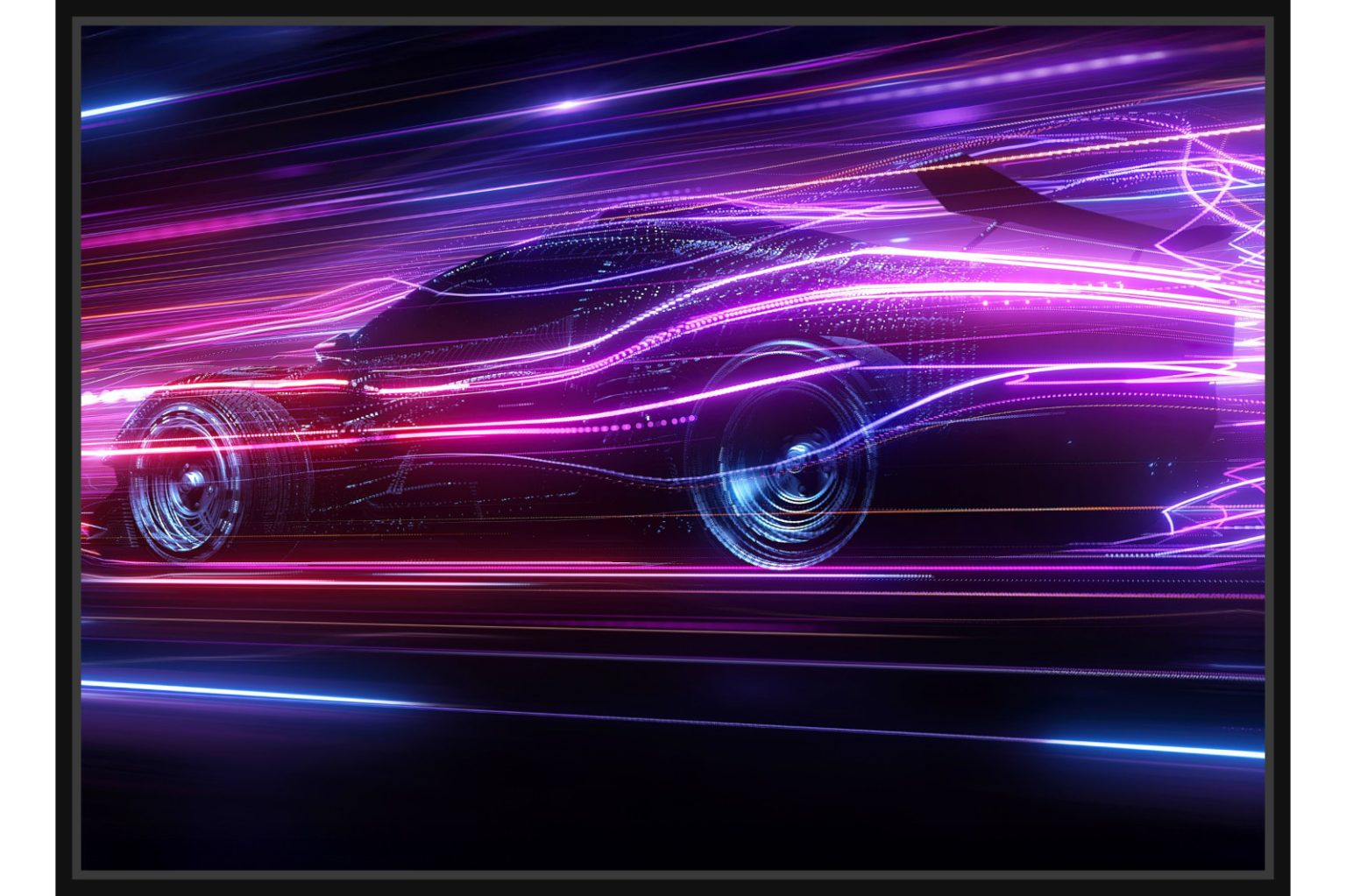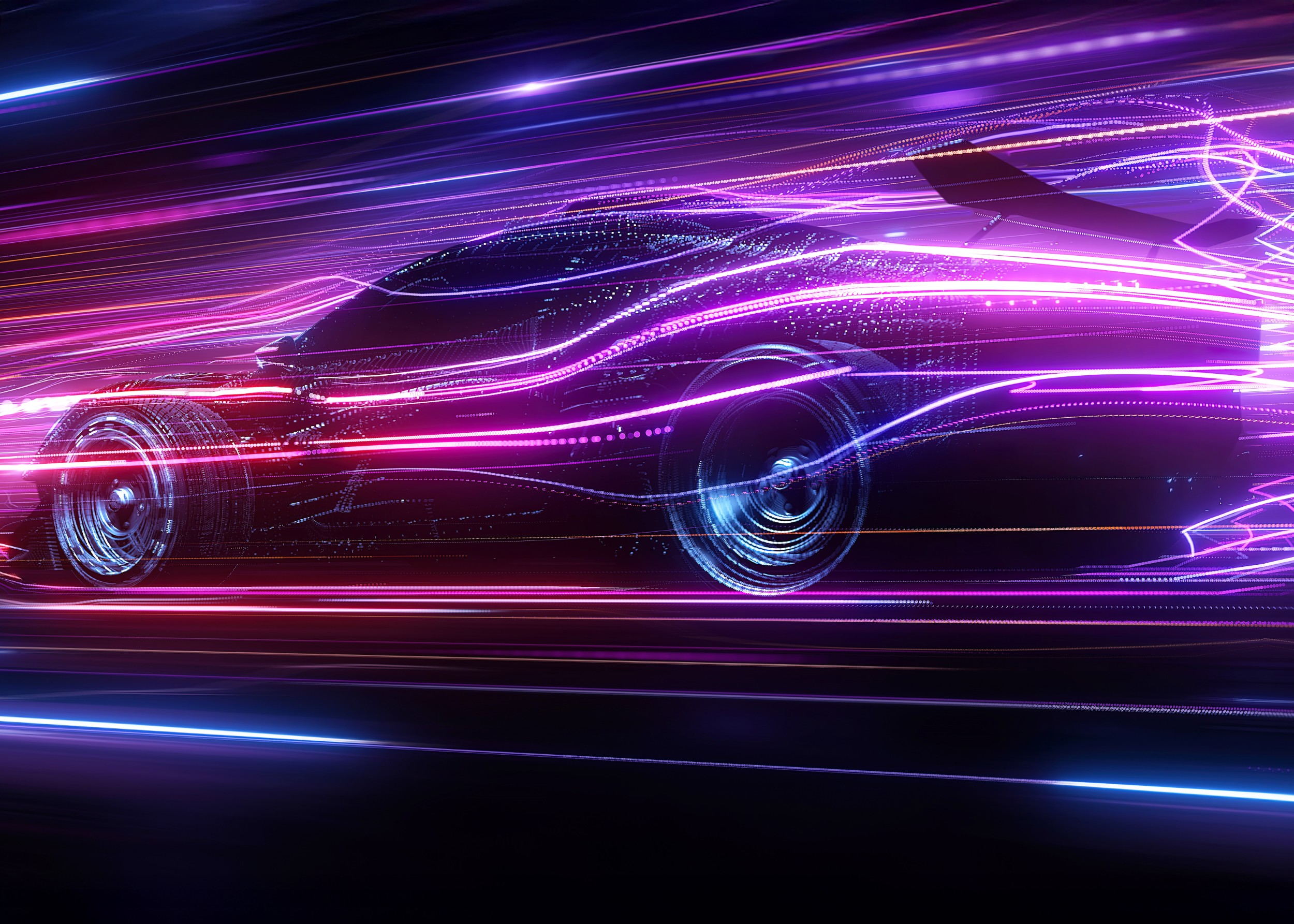 Фотография на спортен автомобил в движение с неонови светлинни линии. Изображението е динамично и създава усещане за бъдеще и енергия.