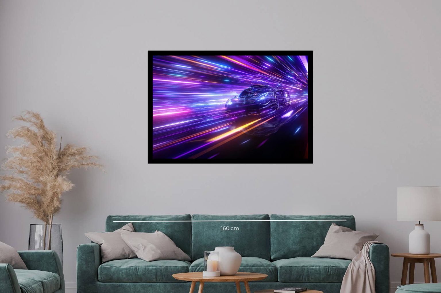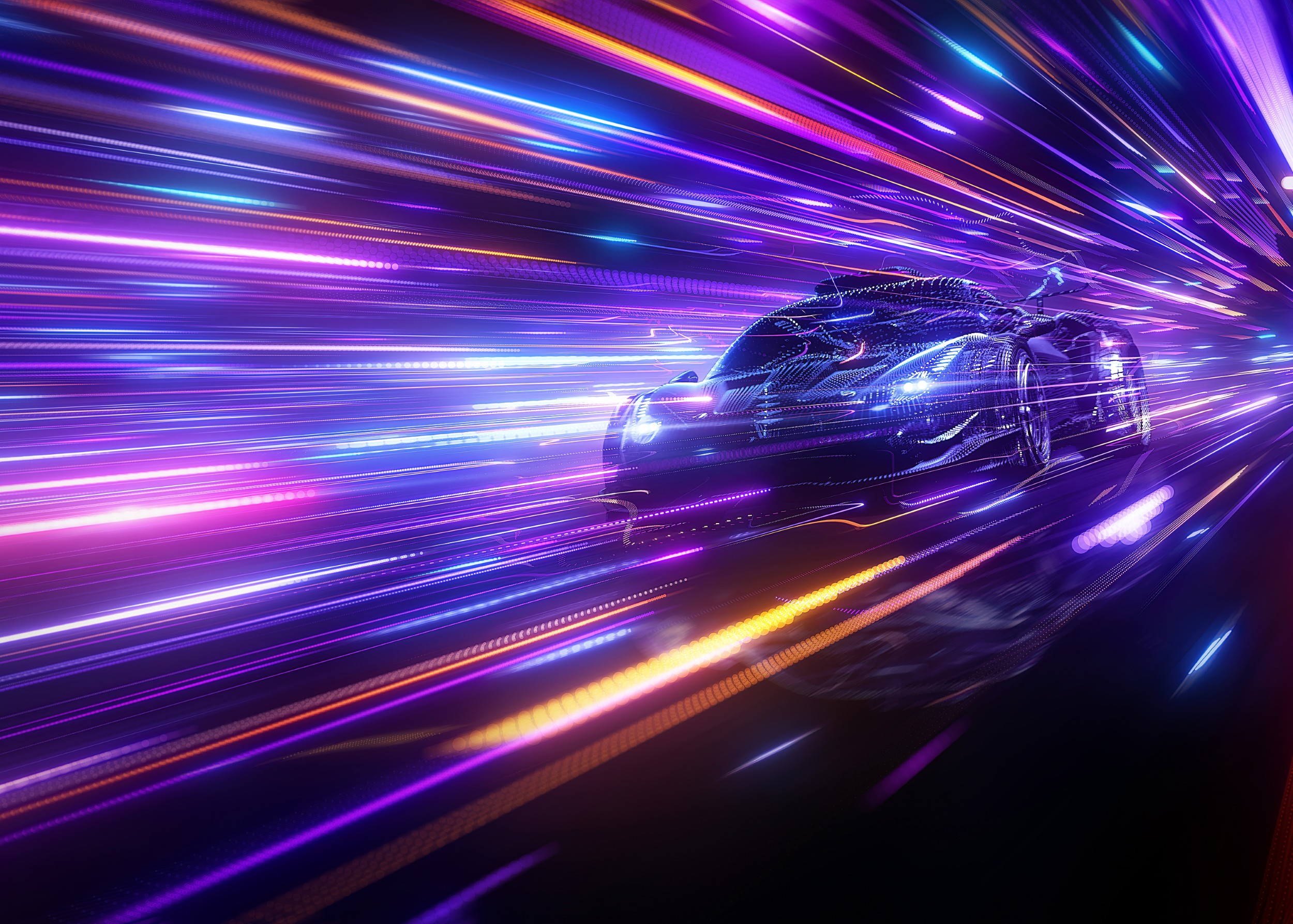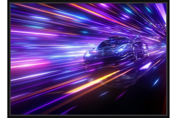 Футуристична фотография на спортен автомобил, заобиколен от ярки неонови светлини в движение. Енергията и светлинните ефекти създават усещане за скорост и динамика.