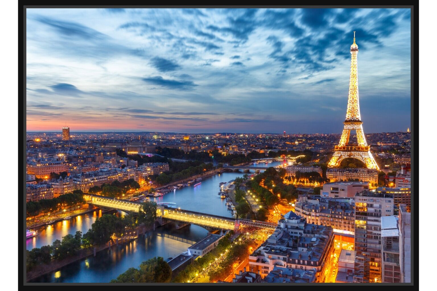 Вълшебна вечерна фотография на Париж с Айфеловата кула, блестяща над града и реката Сена. Светлините на града създават романтична и елегантна атмосфера, уловена в този иконичен кадър.