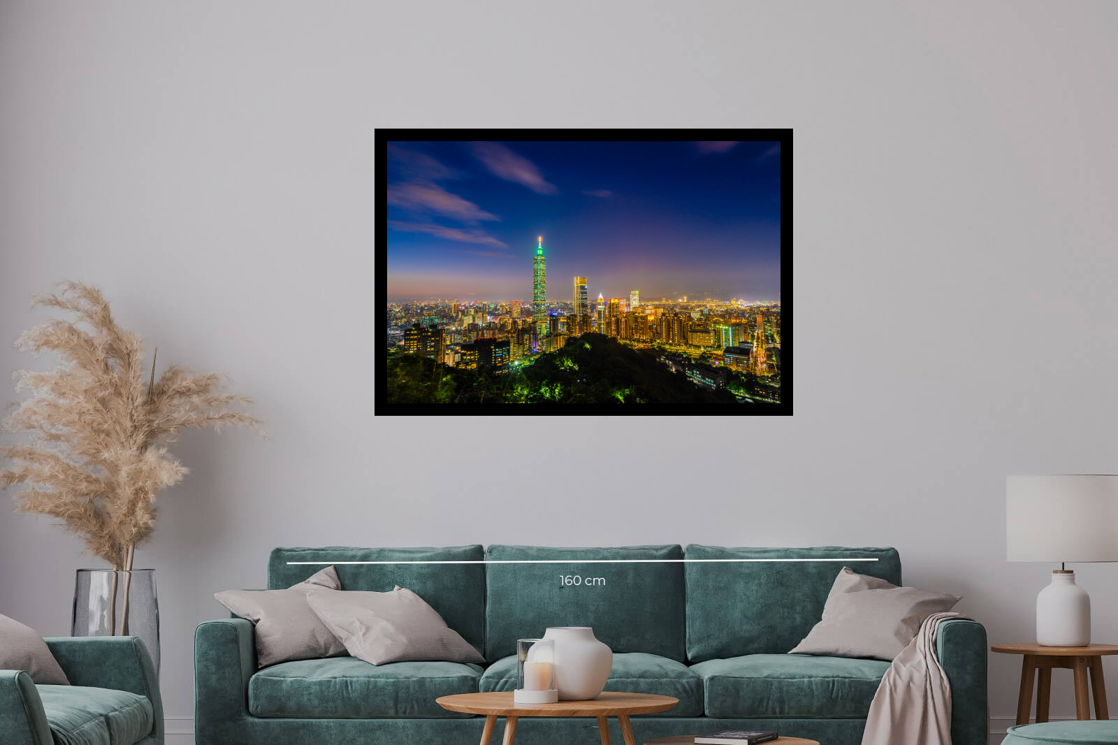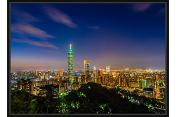 Вечерна снимка на Тайпе, където Тайпе 101 се издига над блестящия град. Светлините на небостъргачите и тъмносиньото небе създават контраст и усещане за енергия и движение.