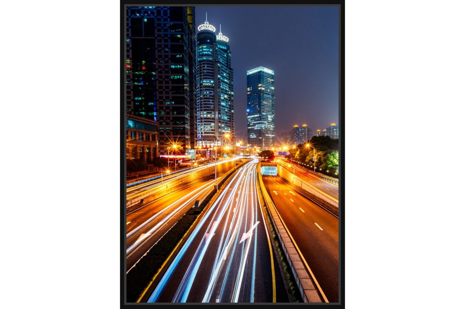 Динамичен кадър на нощен град с ярки светлини от автомобилния трафик, който създава усещане за скорост и енергия. Високите сгради и светлините на небостъргачите подчертават съвременната градска архитектура.