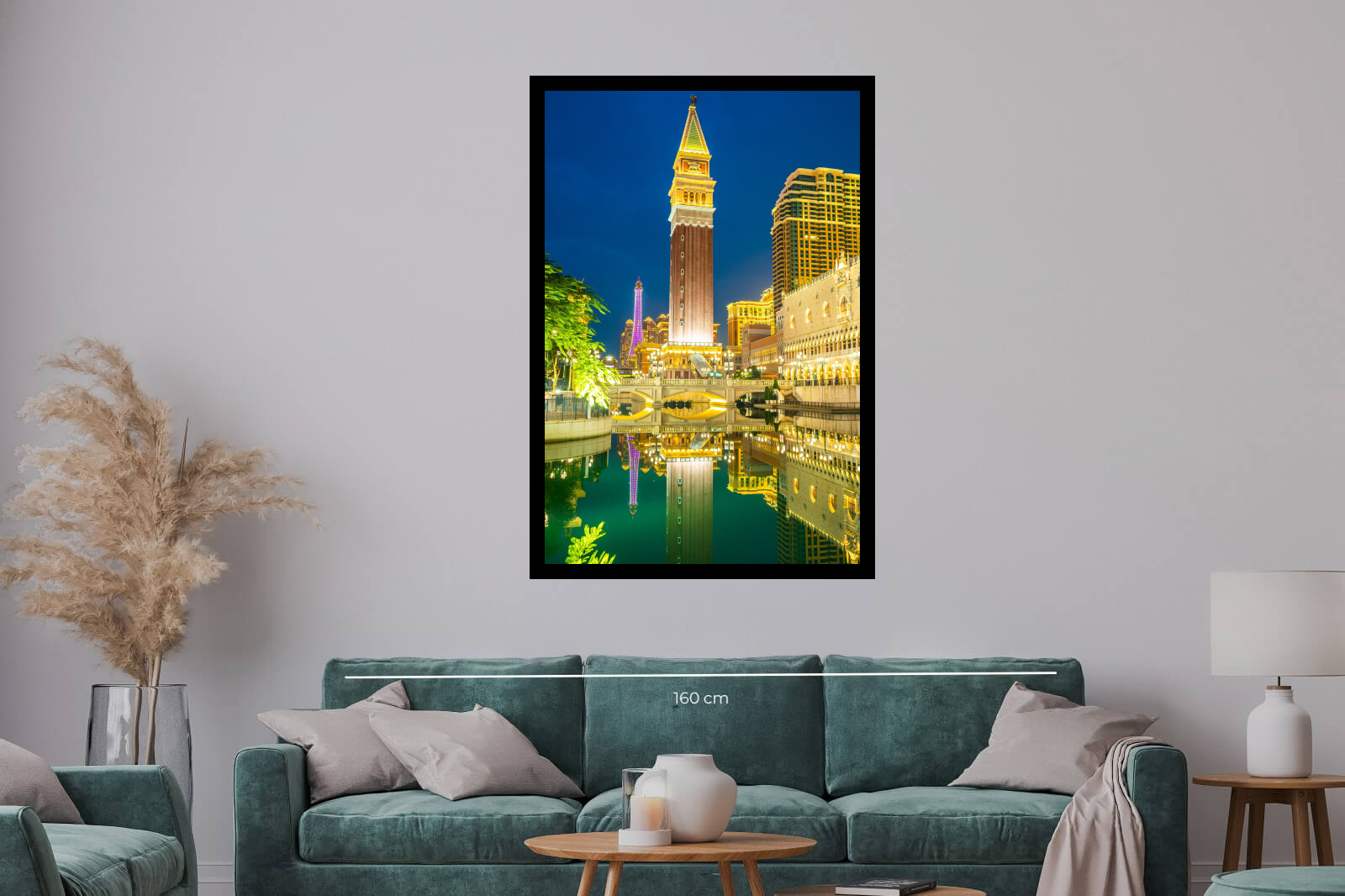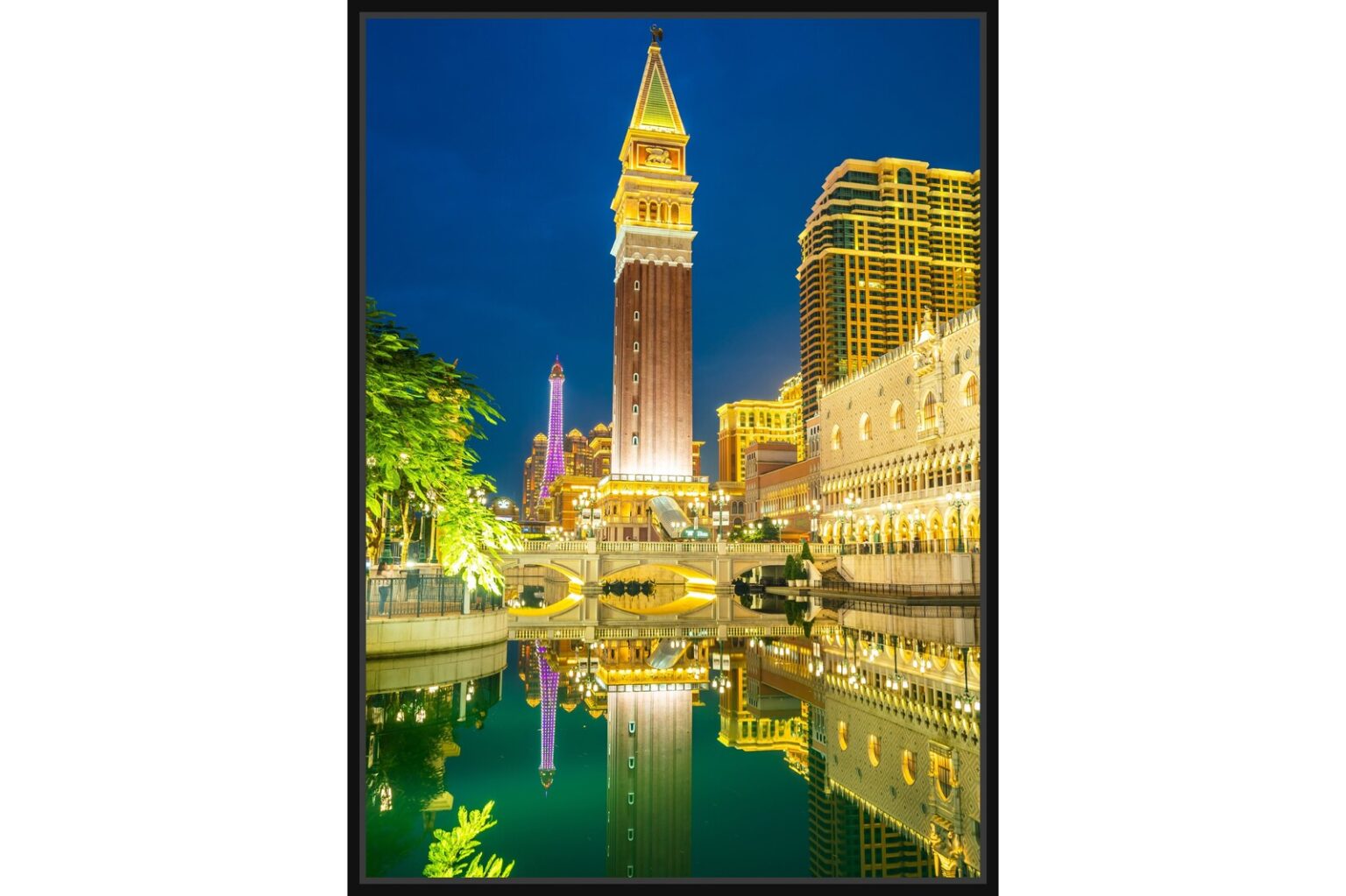 Фотография на Макао с величествена кула, ярко осветена в нощта и отражения във водата. Луксозна атмосфера и модерна архитектура, създаваща усещане за енергия и живот.
