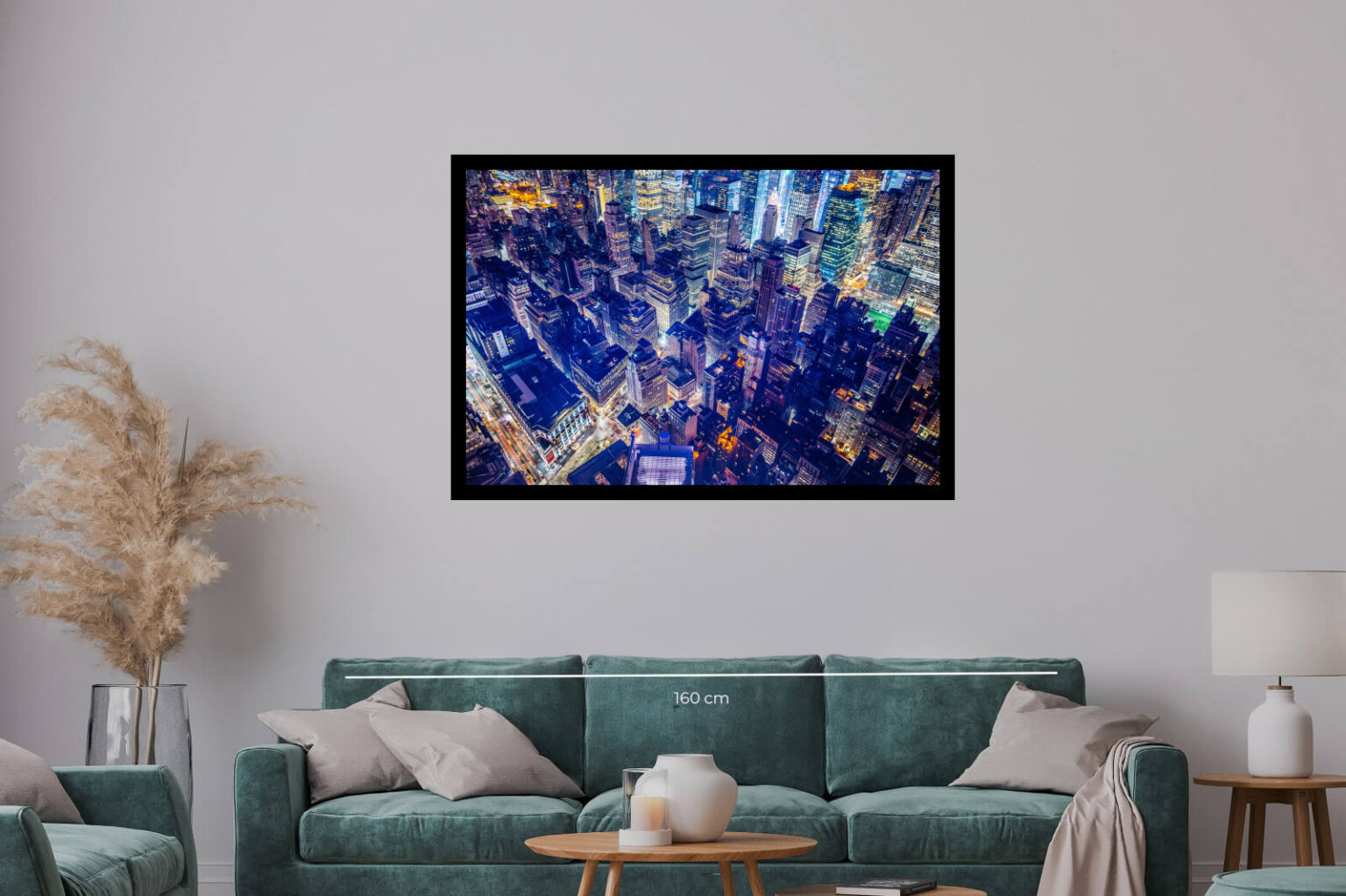 Драматична въздушна снимка на Ню Йорк през нощта, с осветени улици и небостъргачи, които създават ярък и динамичен градски пейзаж.