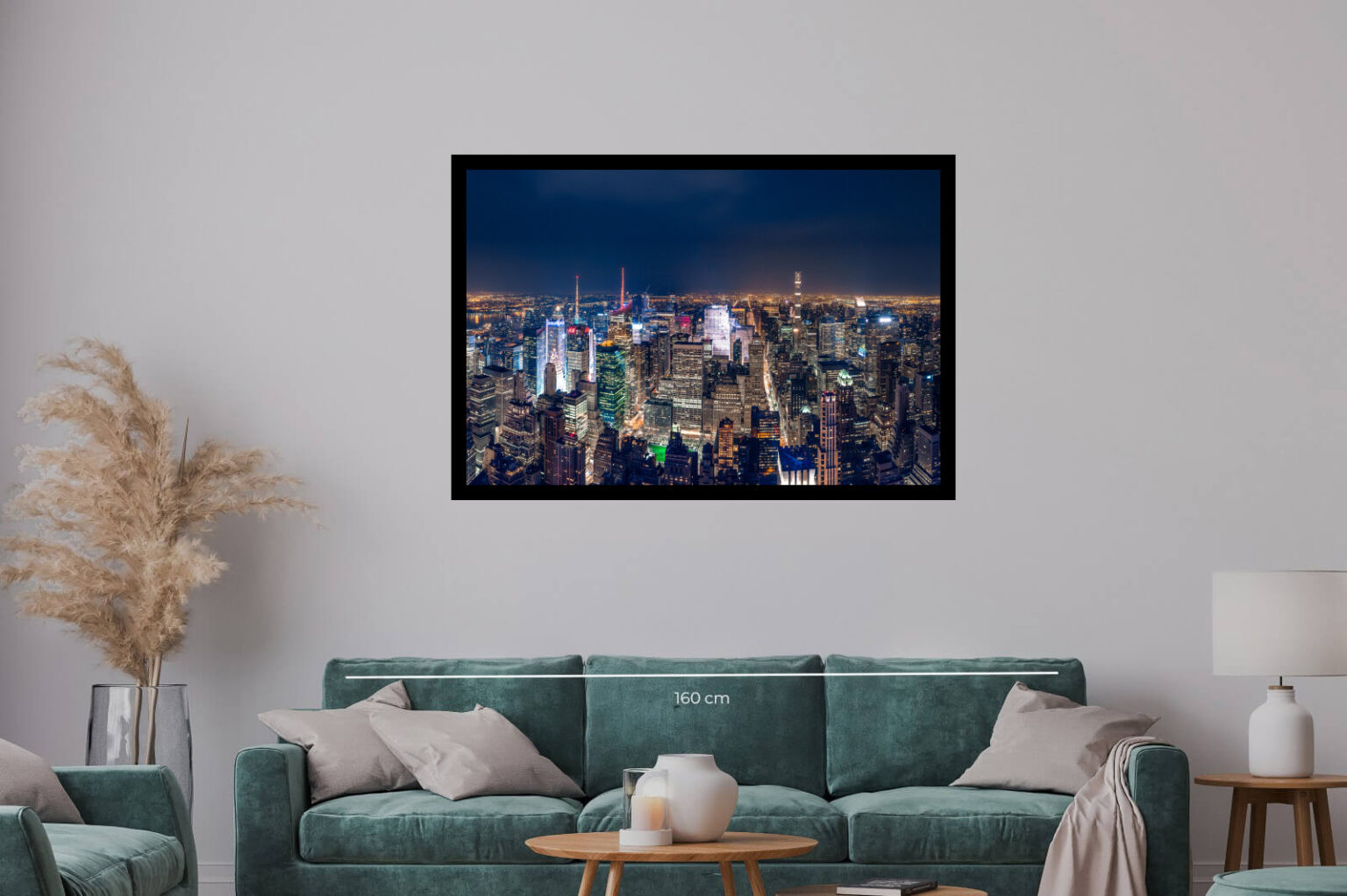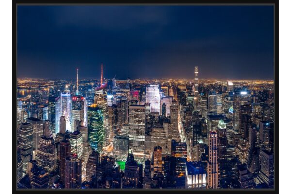 Широка панорама на Ню Йорк през нощта, където небостъргачите и светлините на Манхатън се простират безкрайно. Градът, който никога не спи, оживява в светлинни нюанси и динамика.