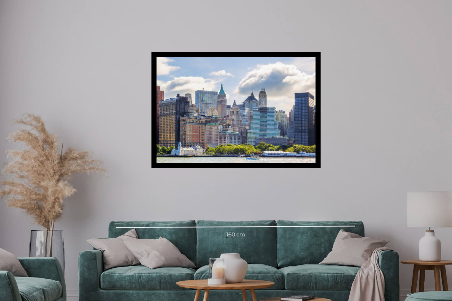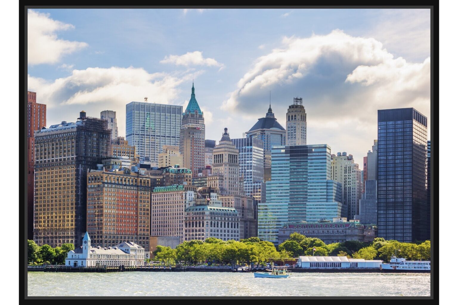 Панорамен изглед към крайбрежието на Ню Йорк с характерните небостъргачи, заснети в ясен ден. Детайлите в архитектурата и богатите цветове подчертават величието на града.