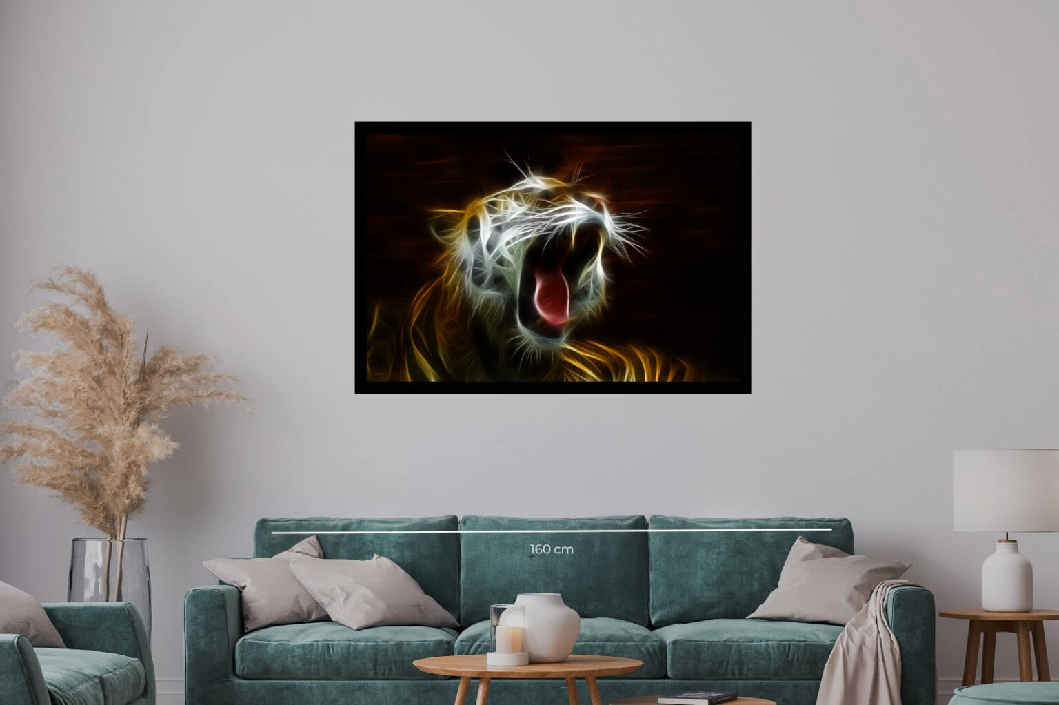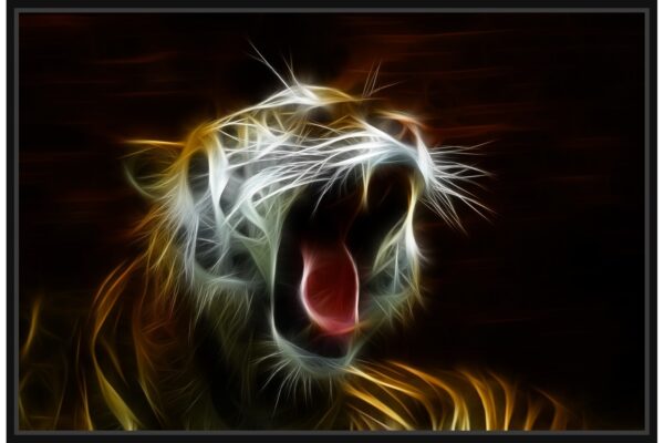 Артистична дигитална визия на тигър с отворена уста, изобразен чрез светещи линии и абстрактни форми. Светлината и цветовете създават усещане за динамика и сила, напомнящи енергийни потоци. Уникален модерен поглед към класическата животинска фотография.