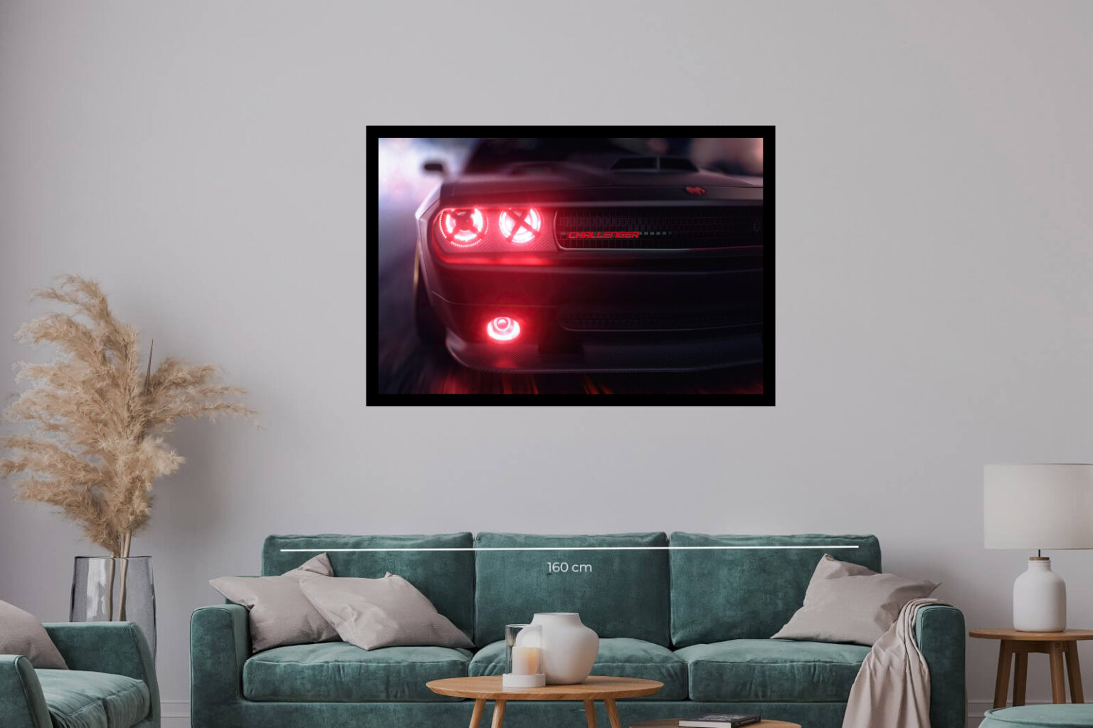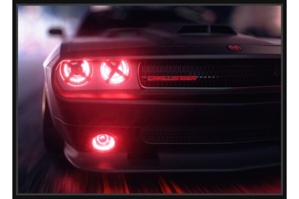 Арт фотография на Dodge Challenger с ярко червени фарове, заснета нощем. Светлинните акценти подчертават спортния характер и мощта на автомобила.