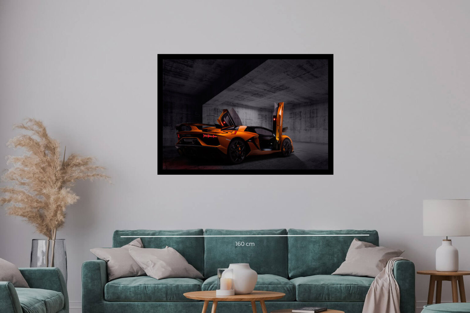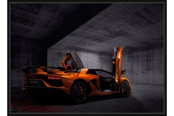 Оранжев Lamborghini Aventador с отворени врати в индустриално пространство. Силуетът на колата, комбиниран с драматично осветление, подчертава нейната агресивна и спортна природа.