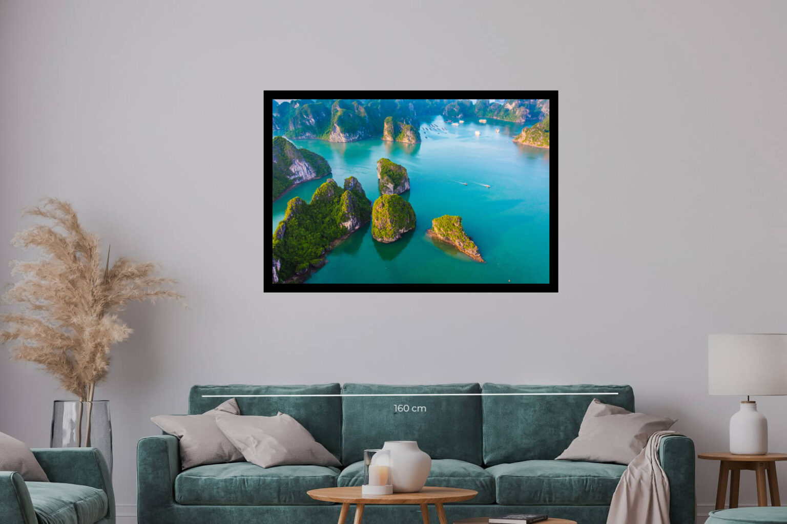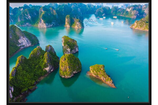 Живописна въздушна гледка към зелените острови на Халонг Бей, заобиколени от тюркоазени води. Красотата на Виетнам е уловена от високо.
