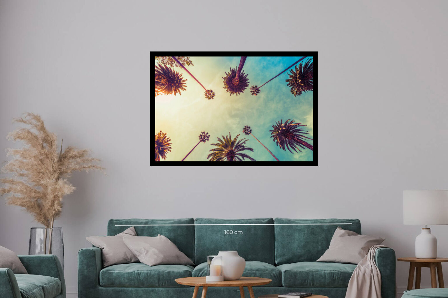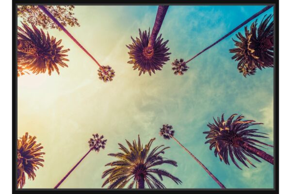 Фотография на палми, заснети от необичаен ъгъл отдолу, обгърнати от небето в жълти и тюркоазени оттенъци. Дърветата създават геометричен ритъм, а цветовете подчертават екзотичната атмосфера.