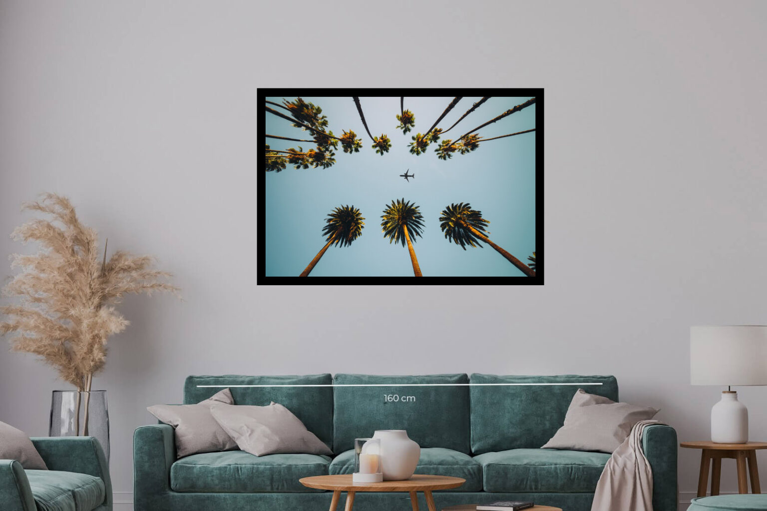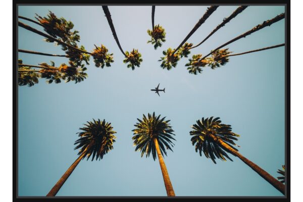 Артистична фотография на високи палми, заснети отдолу нагоре, с преминаващ самолет в небето. Снимката предава динамика и усещане за пътуване, комбинирайки природа и модерност.