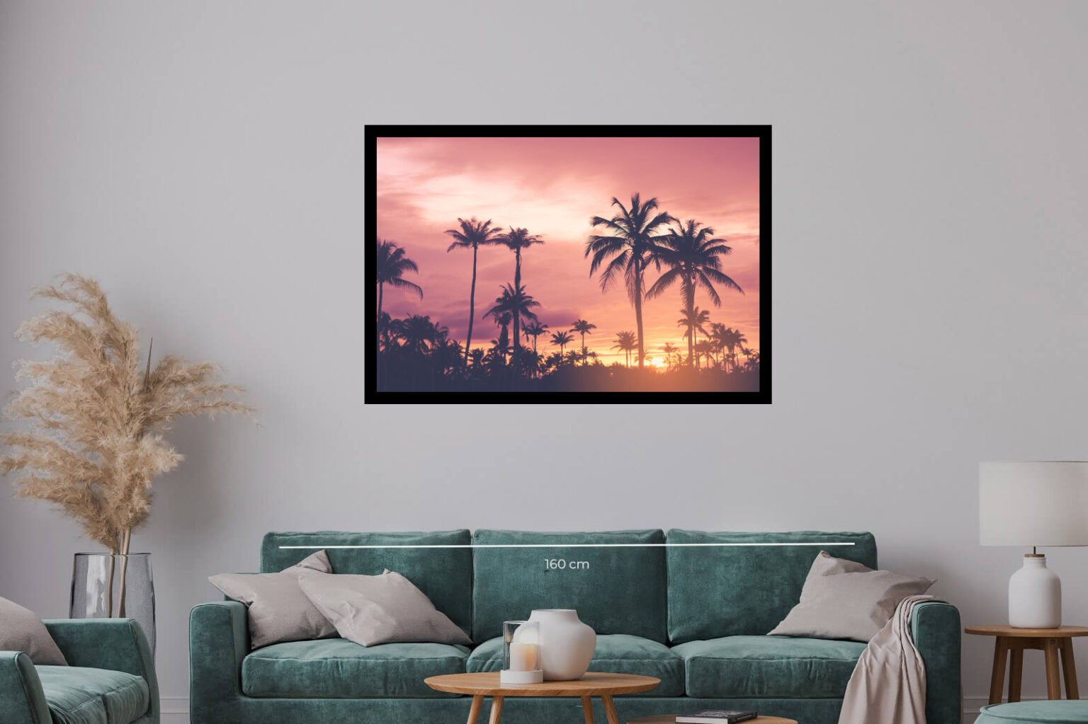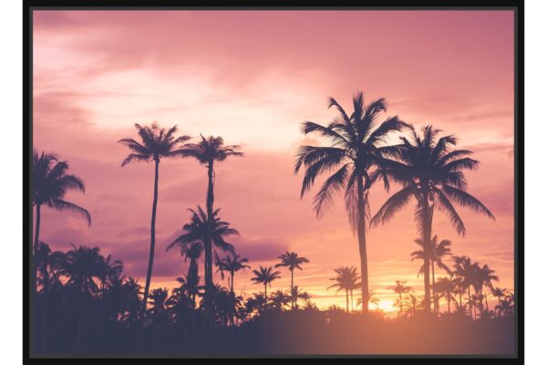 Фотография на високи палми, очертани на фона на драматичен залез с нюанси на розово, лилаво и златно. Силуетите на дърветата създават екзотична атмосфера, която носи усещане за спокойствие и бягство от ежедневието.
