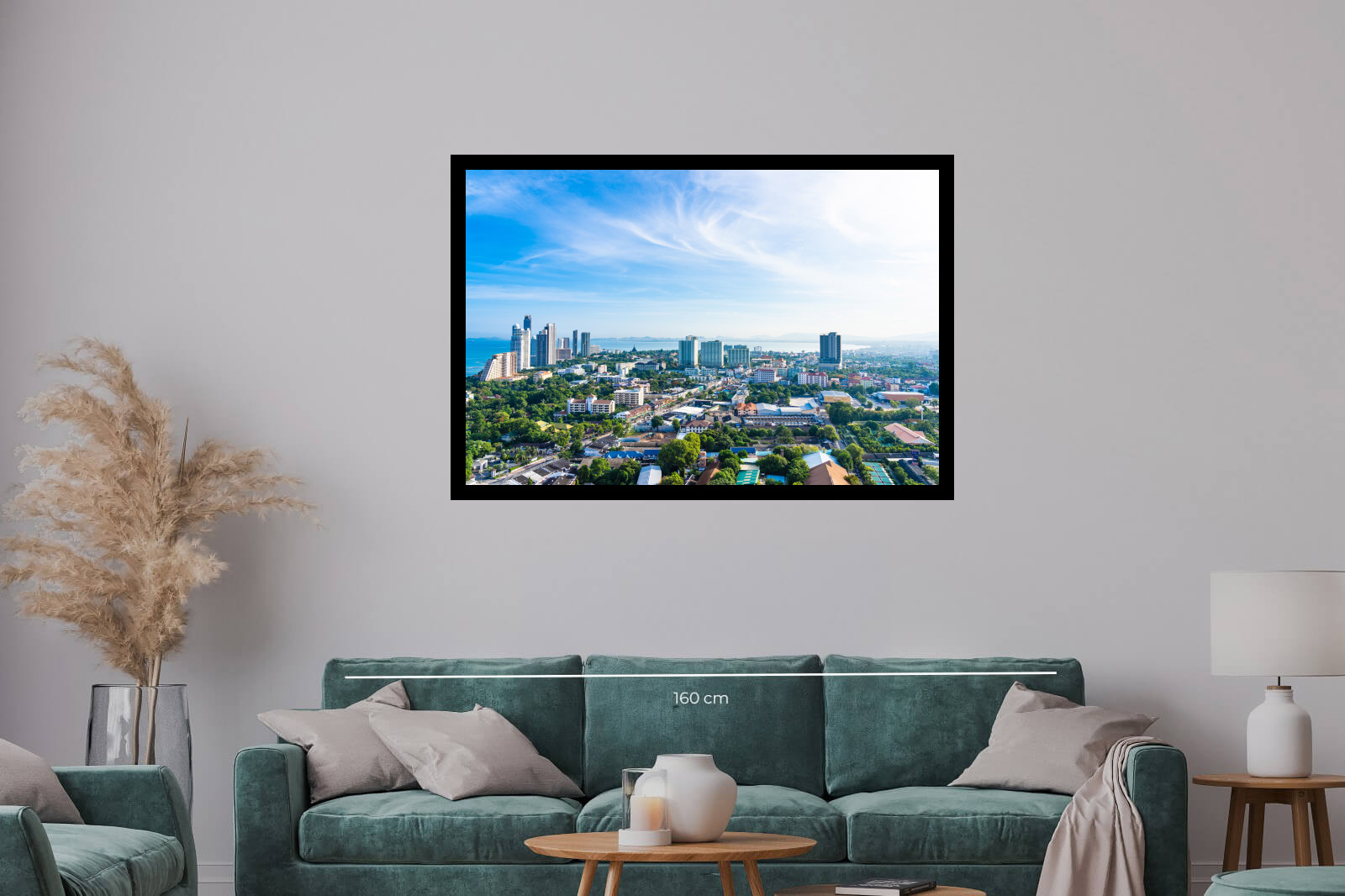 Изглед от високо към крайбрежен град с модерни сгради и зелени площи, преливащи към сините води на океана. Ясно небе създава усещане за простор.