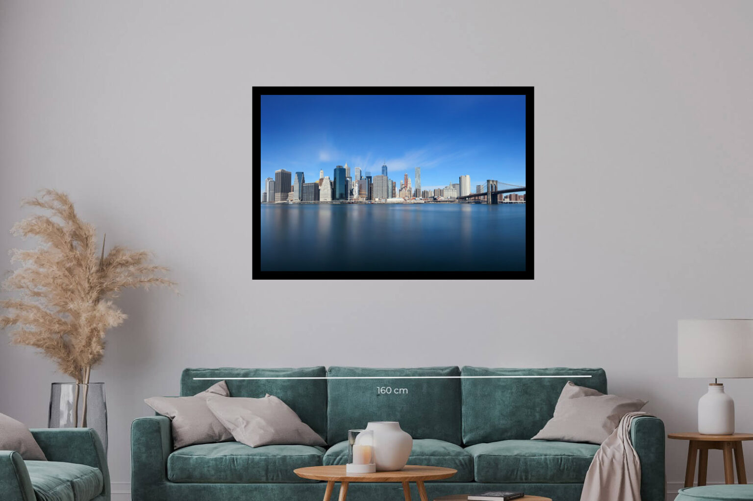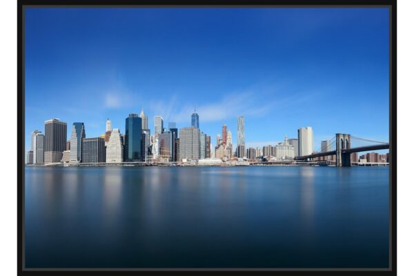 Широкоформатна панорама на Манхатън, заснета от брега с ясен син небе. Водата и небостъргачите създават величествена композиция, подчертаваща съвременния урбанистичен пейзаж.
