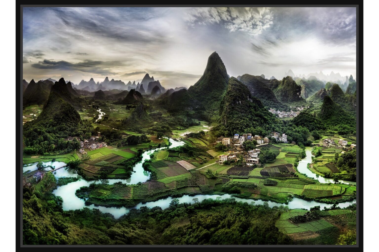 Панорамна фотография на река, извиваща се сред зелени поля и планини. Малките селища и драматичното небе добавят мащаб и дълбочина към пейзажа.