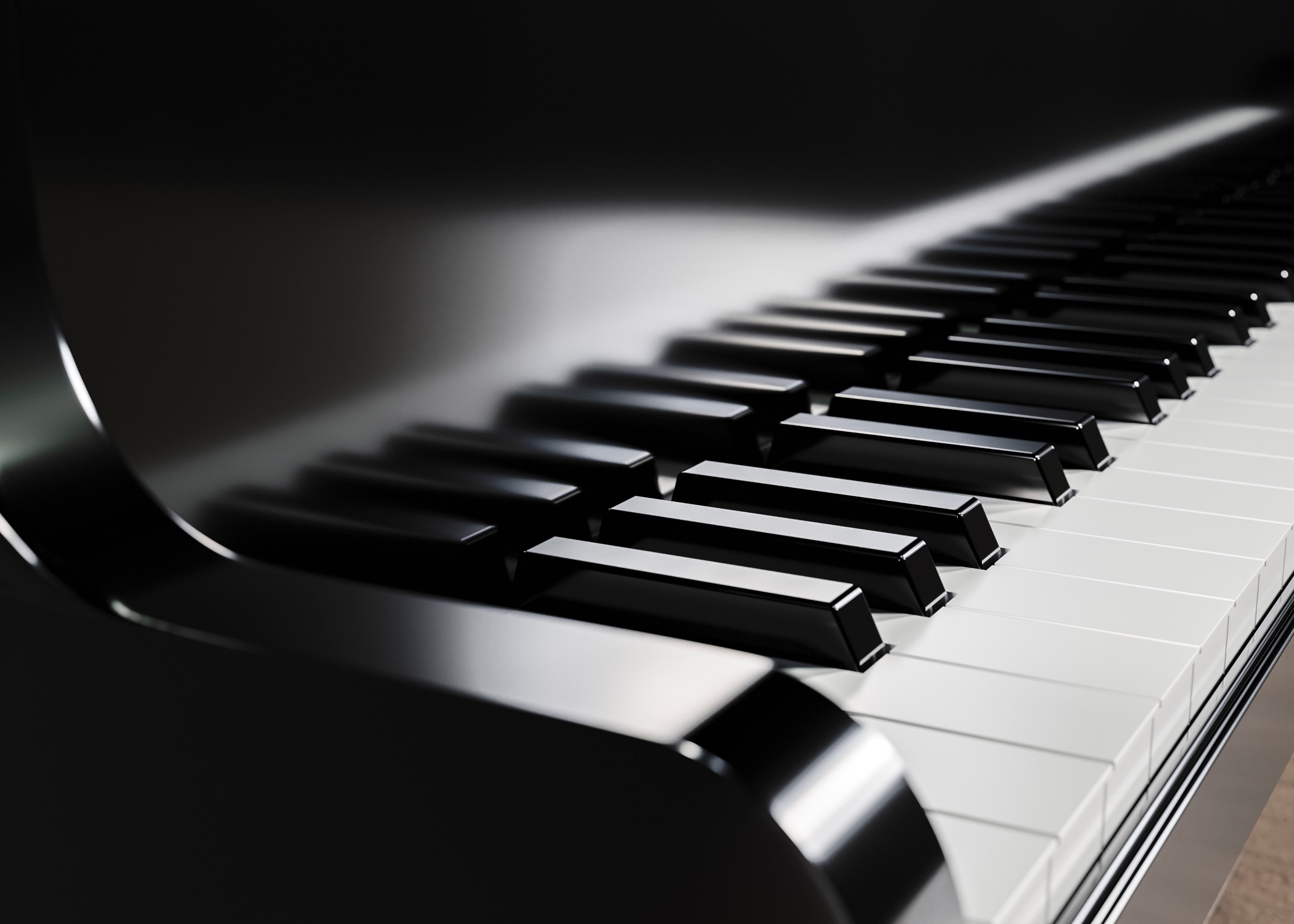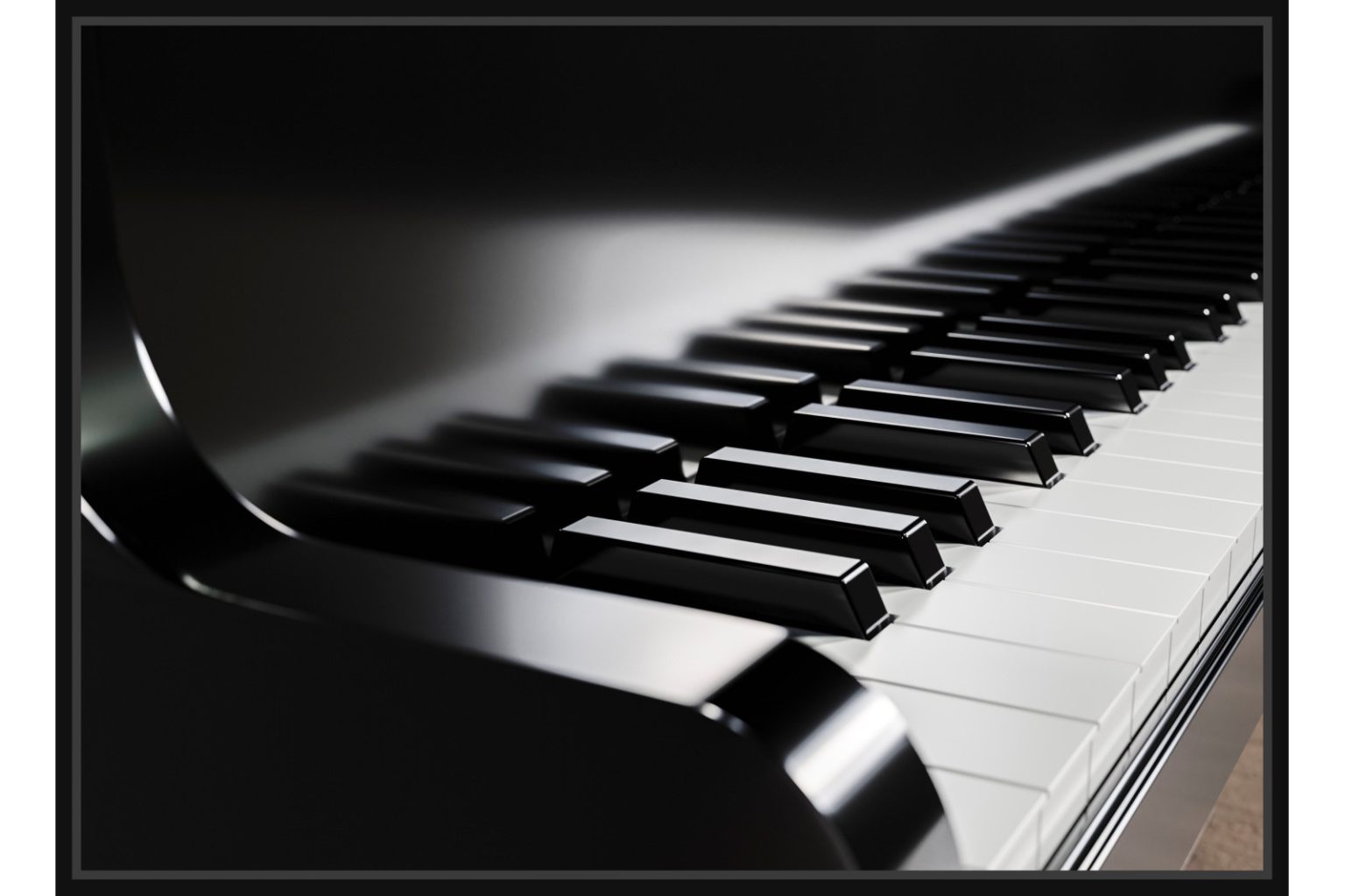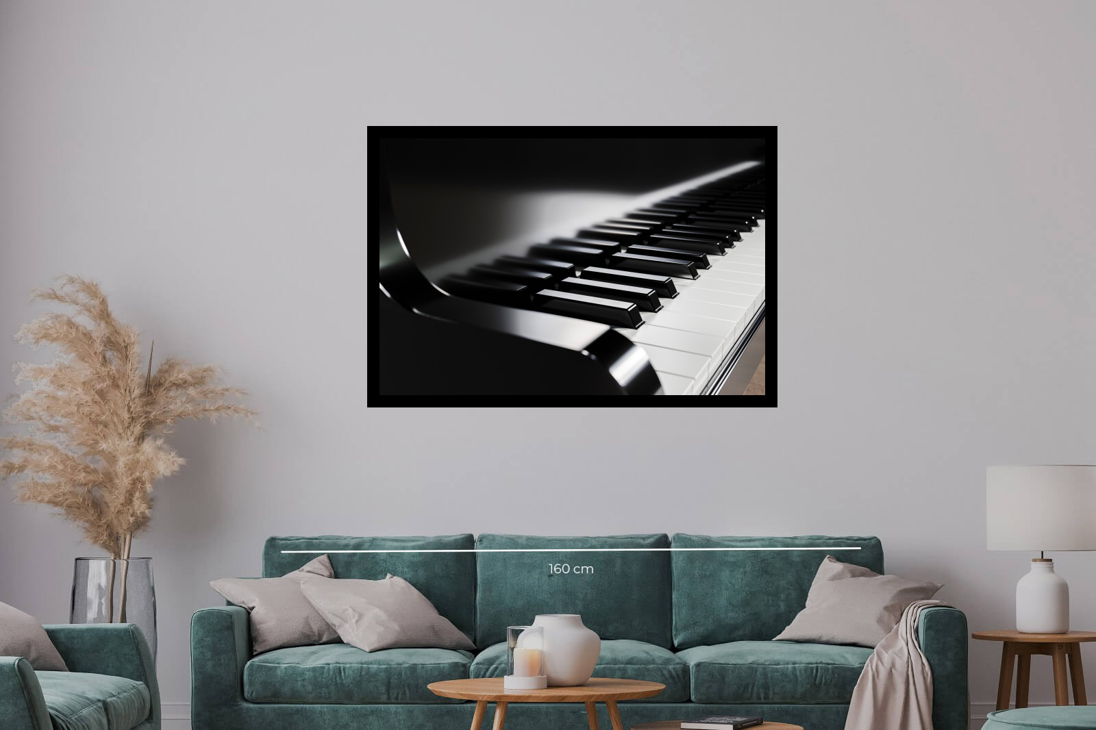 Съвременна фотография на пиано клавиши, заснети отблизо. Лъскавата повърхност и контрастът между черно и бяло създават елегантност и минимализъм. Подходящо за модерни интериори и музикални пространства.