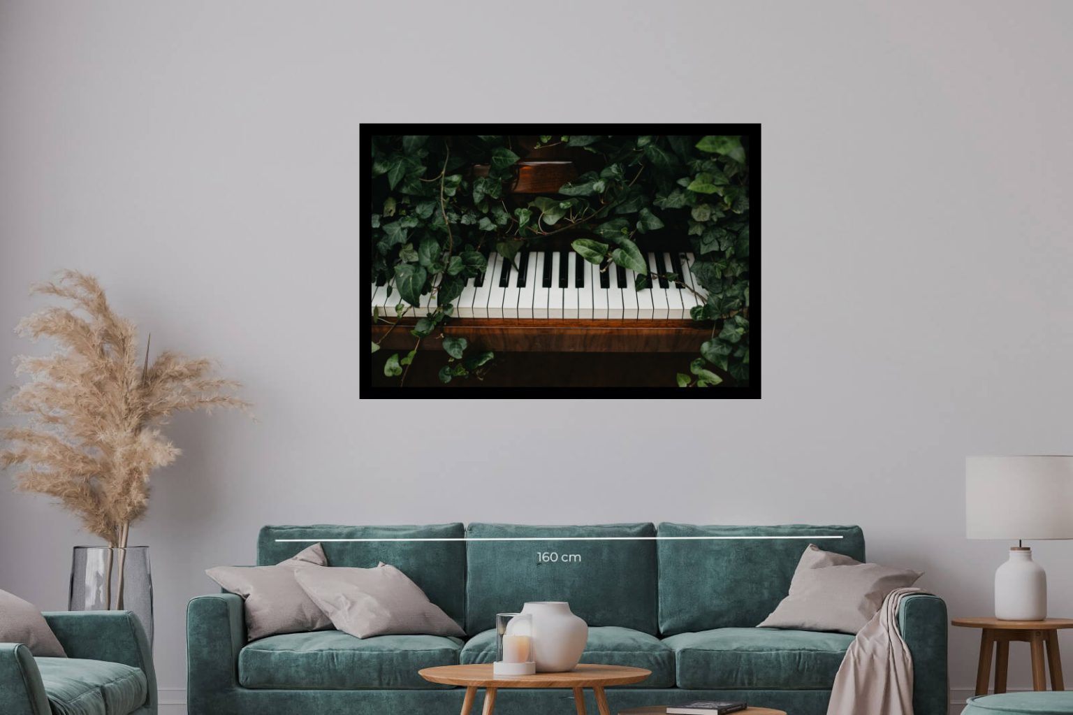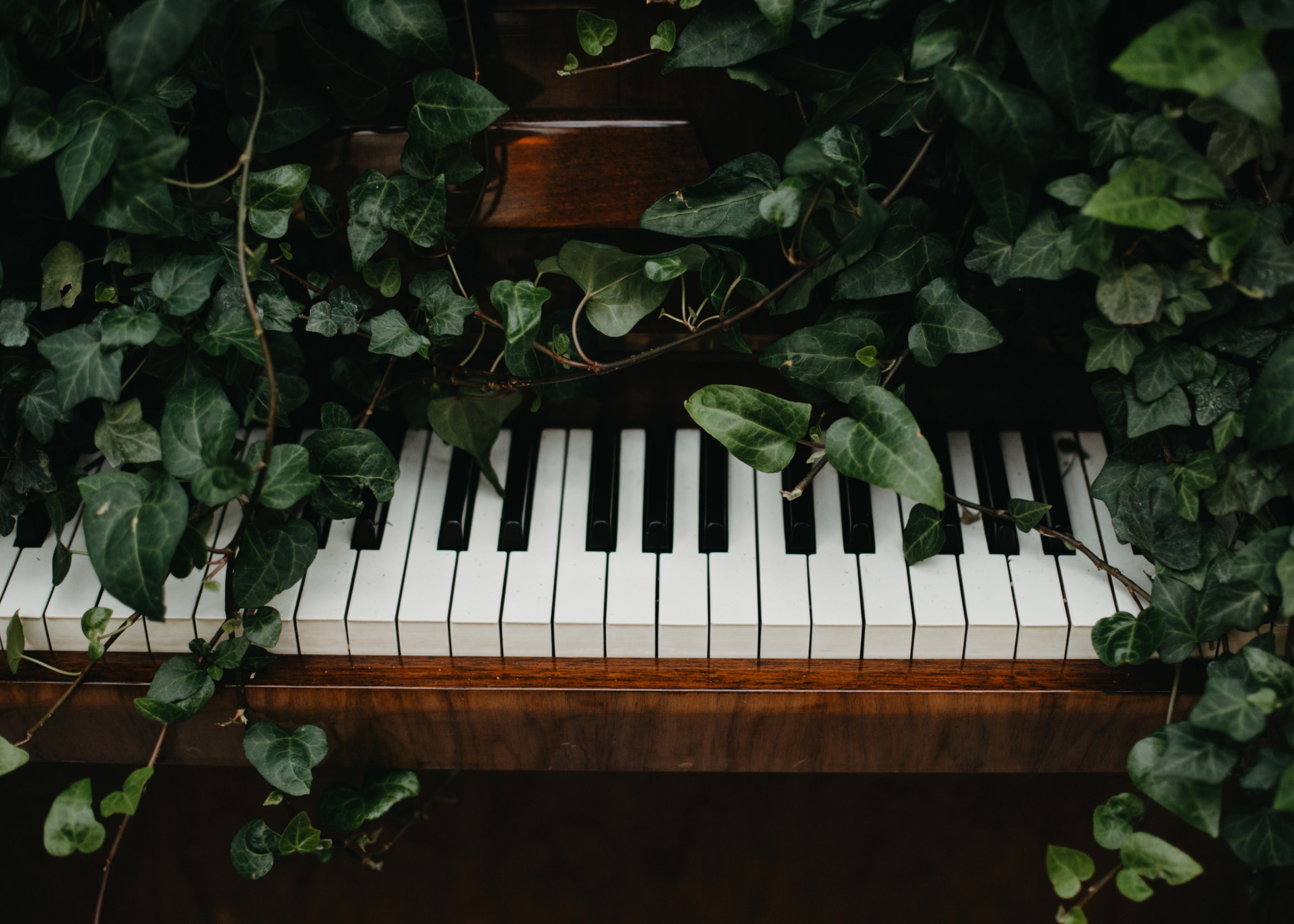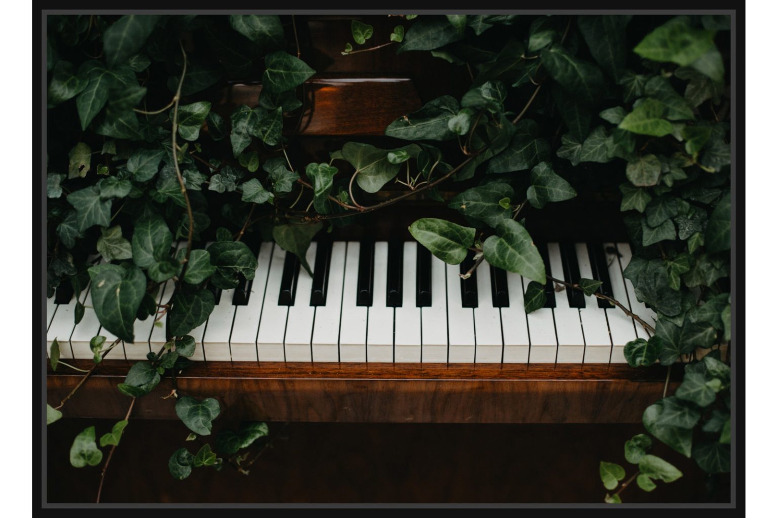 Атмосферна фотография на пиано клавиши, обвити в зелени листа от бръшлян. Снимката носи усещане за природна хармония, симбиоза между изкуството и природата. Идеална за артистични и екологични пространства.