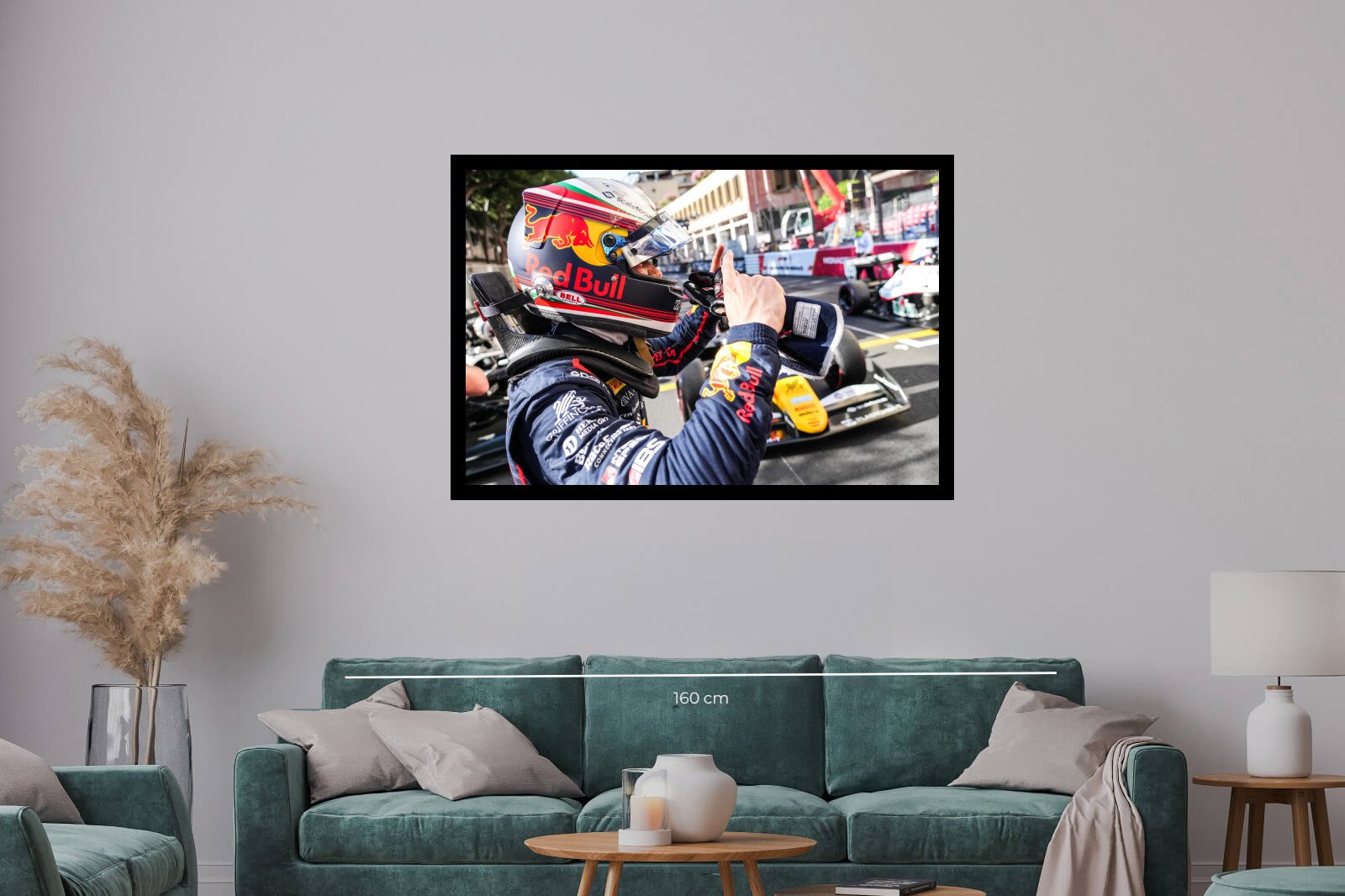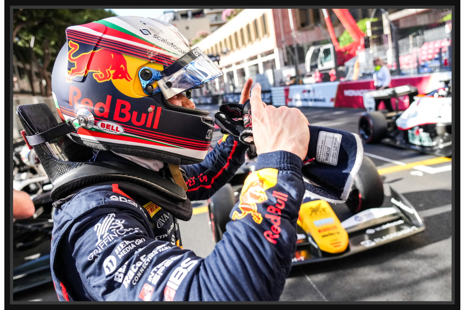 Пилот във Формула 3 с каска Red Bull преди старт.