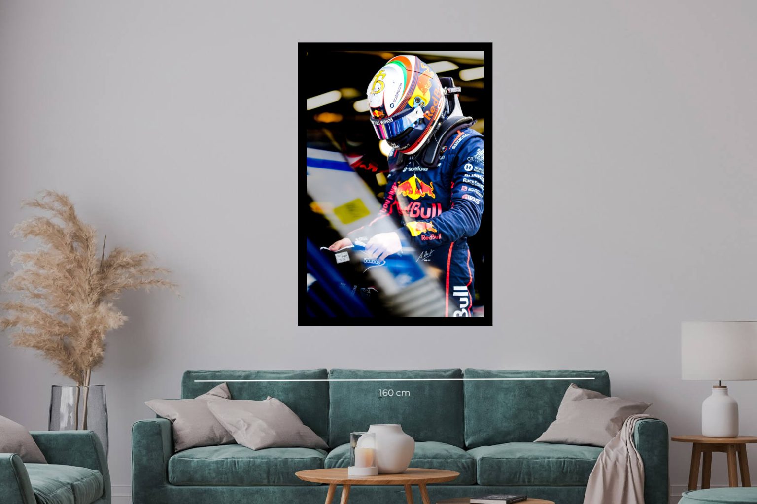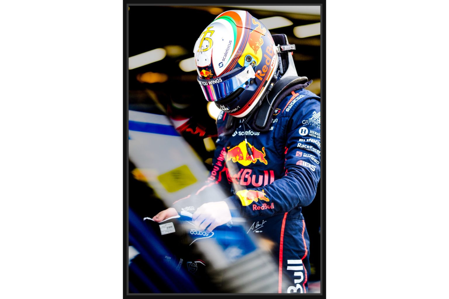 Фотография на пилот Red Bull във Формула 3, заснета преди състезание в бокса. Сцената показва концентрацията и вниманието към детайла в последните моменти на подготовка.