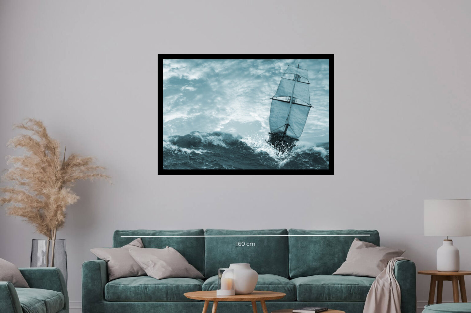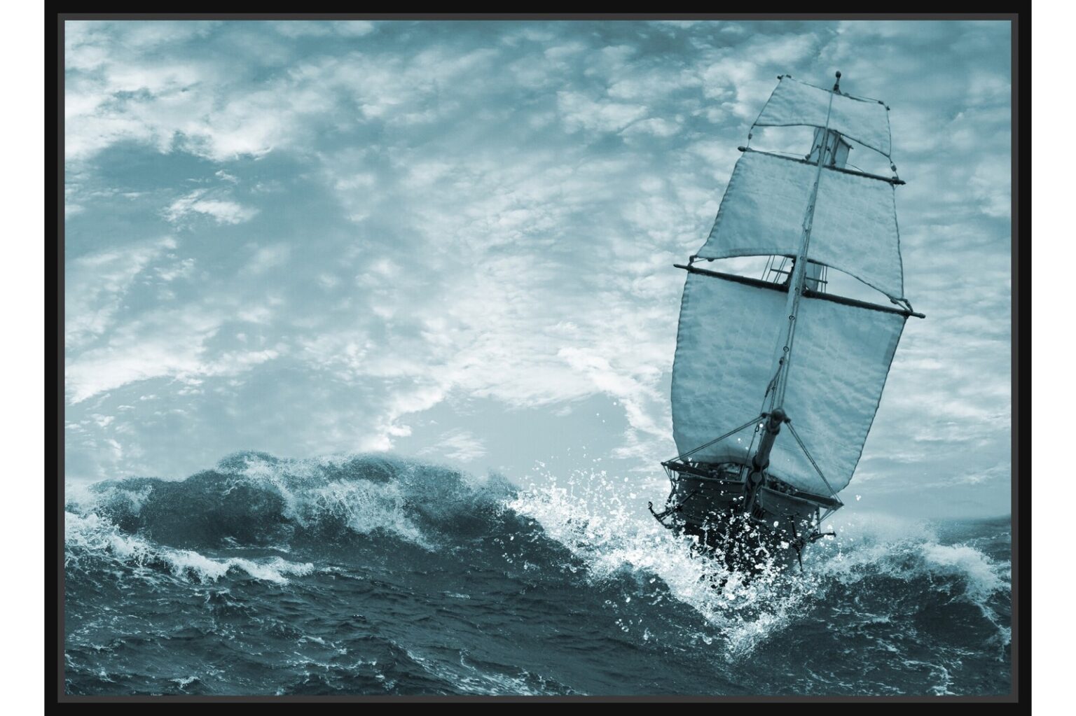 Впечатляваща фотография на старинен кораб, който се бори с мощни вълни насред открито море. Силата на океана и издръжливостта на кораба символизират смелост и приключение.