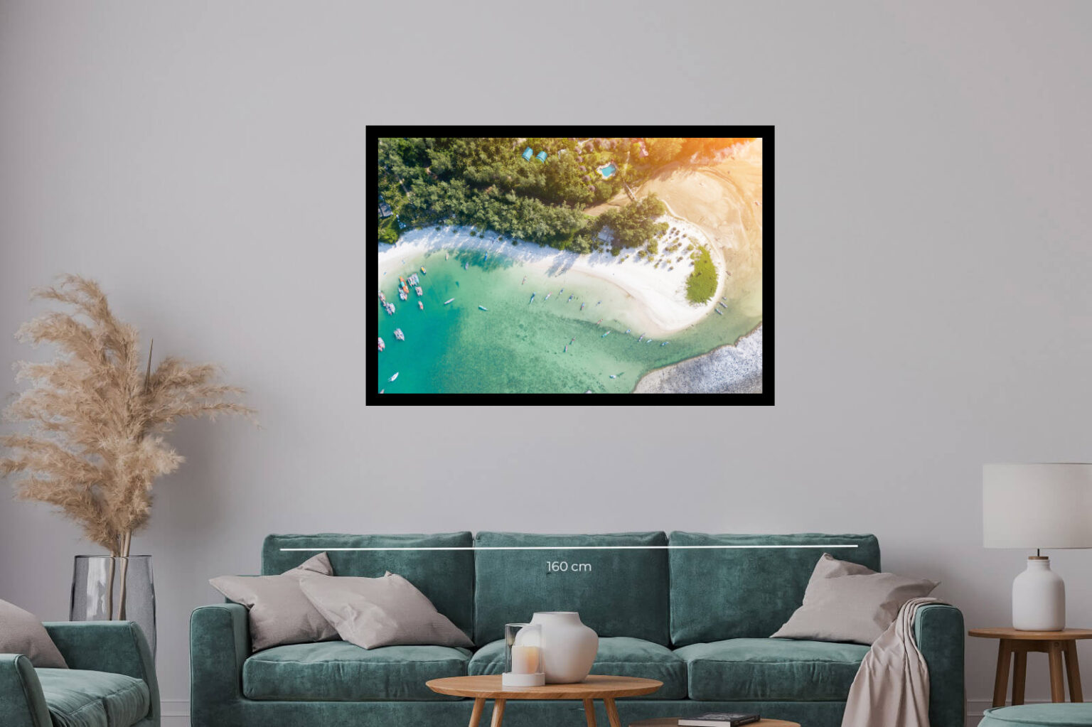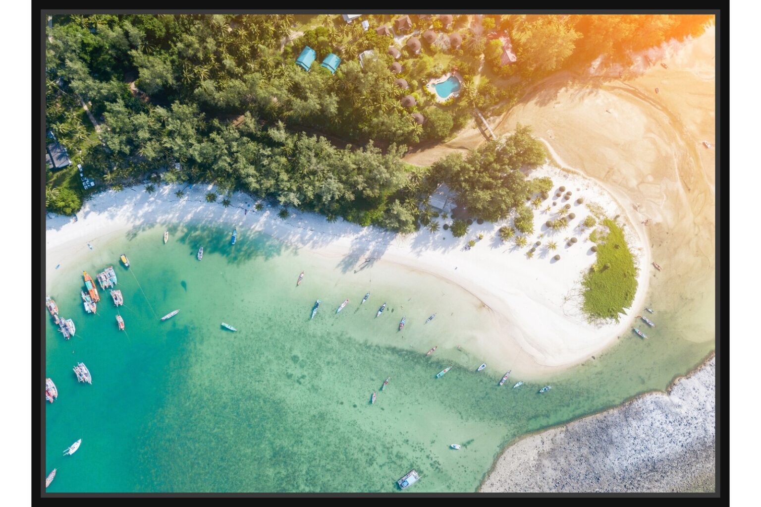 Въздушна фотография на тропически плаж с тюркоазени води, бяла пясъчна ивица и гъста зелена растителност. Малки лодки са подредени в залива, а крайбрежието е огряно от слънцето, придавайки усещане за райско място.