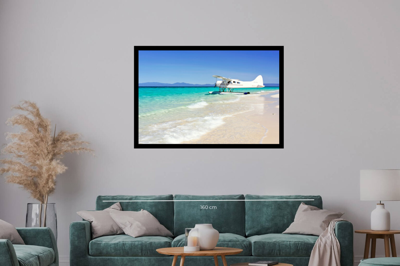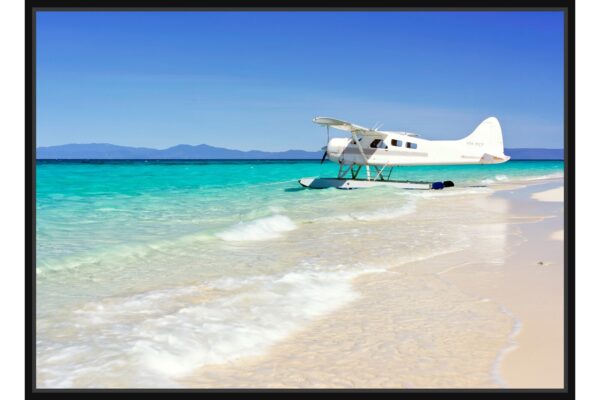 Екзотична сцена с бял пясък, тюркоазено море и хидроплан, спрял на брега. Атмосферата внушава пътешествие и свобода.