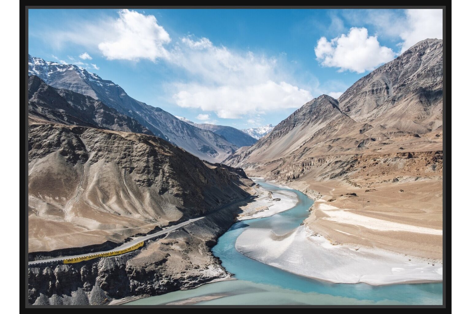 Внушителен изглед на планинска долина с криволичеща река. Синият тон на водата контрастира с кафяво-сивите склонове и белите върхове в далечината.