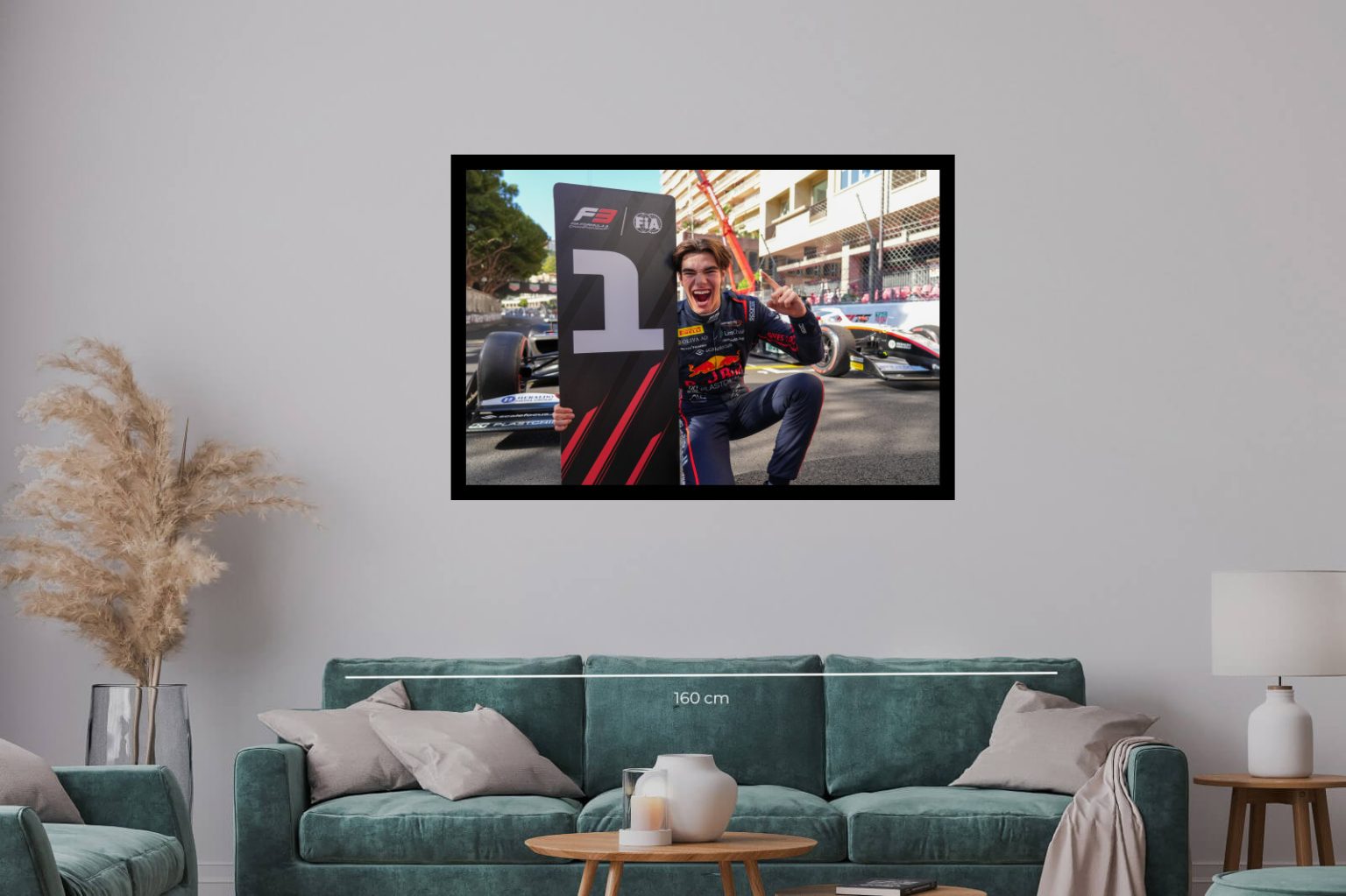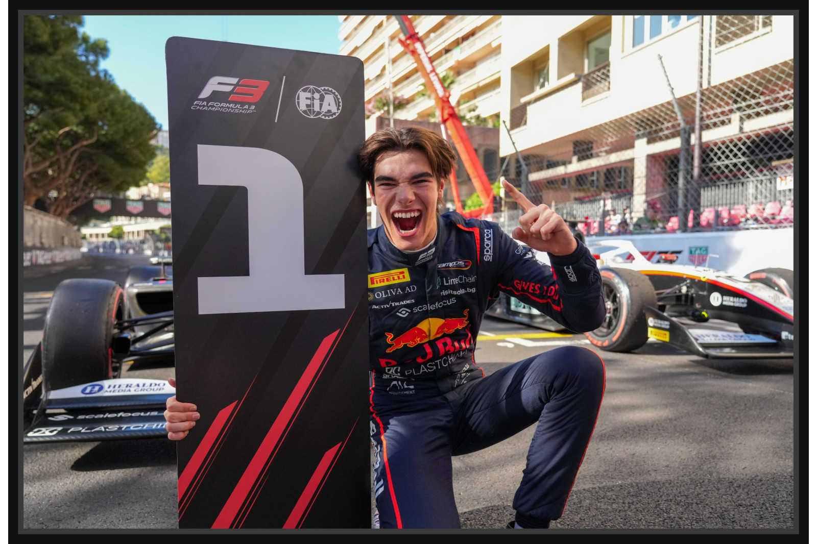 Фотография на млад пилот, празнуващ победа във Формула 3 с табела „1“. Сцената е заредена с емоция и радост от спортния успех, подчертавайки силата на постижението.