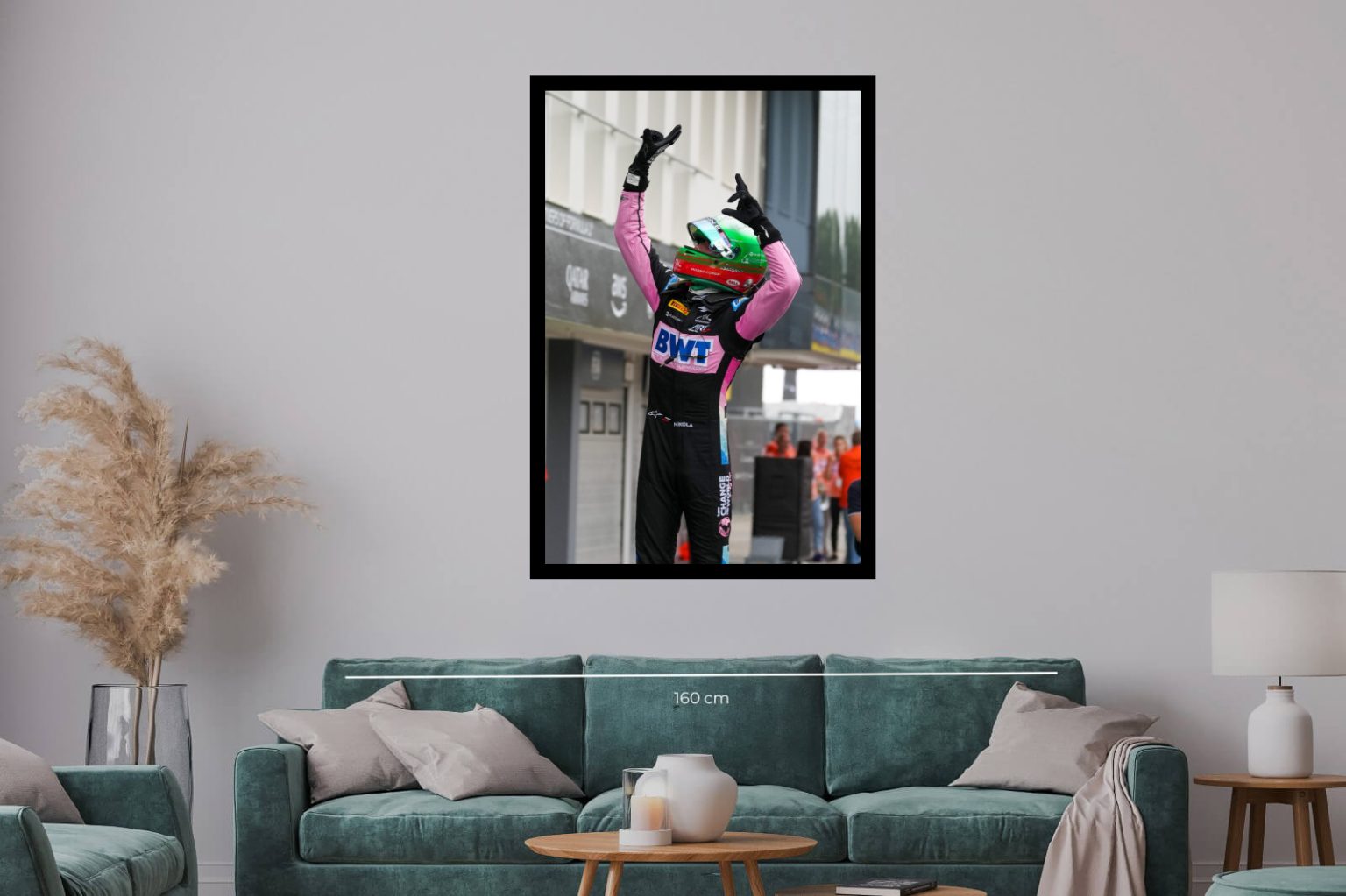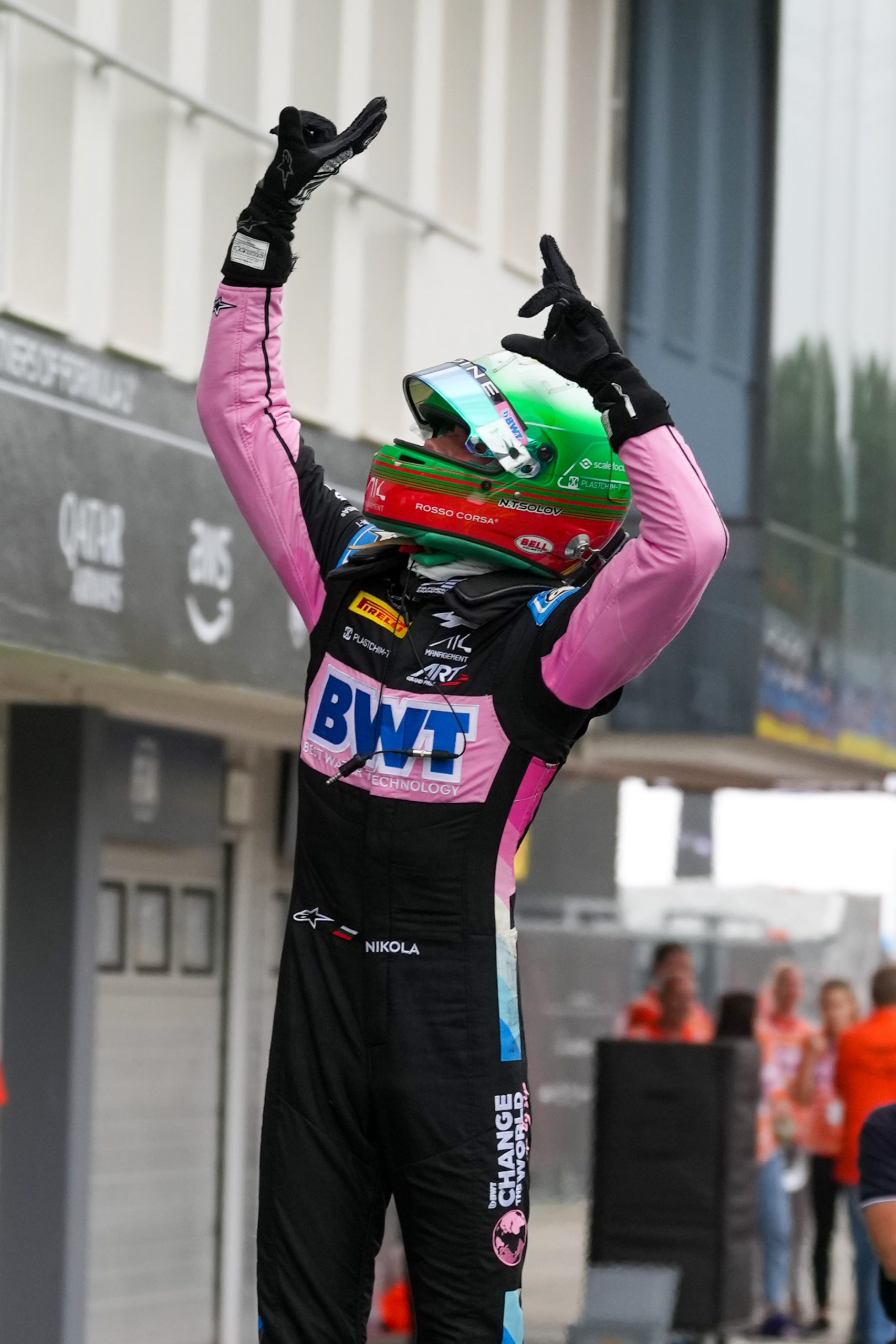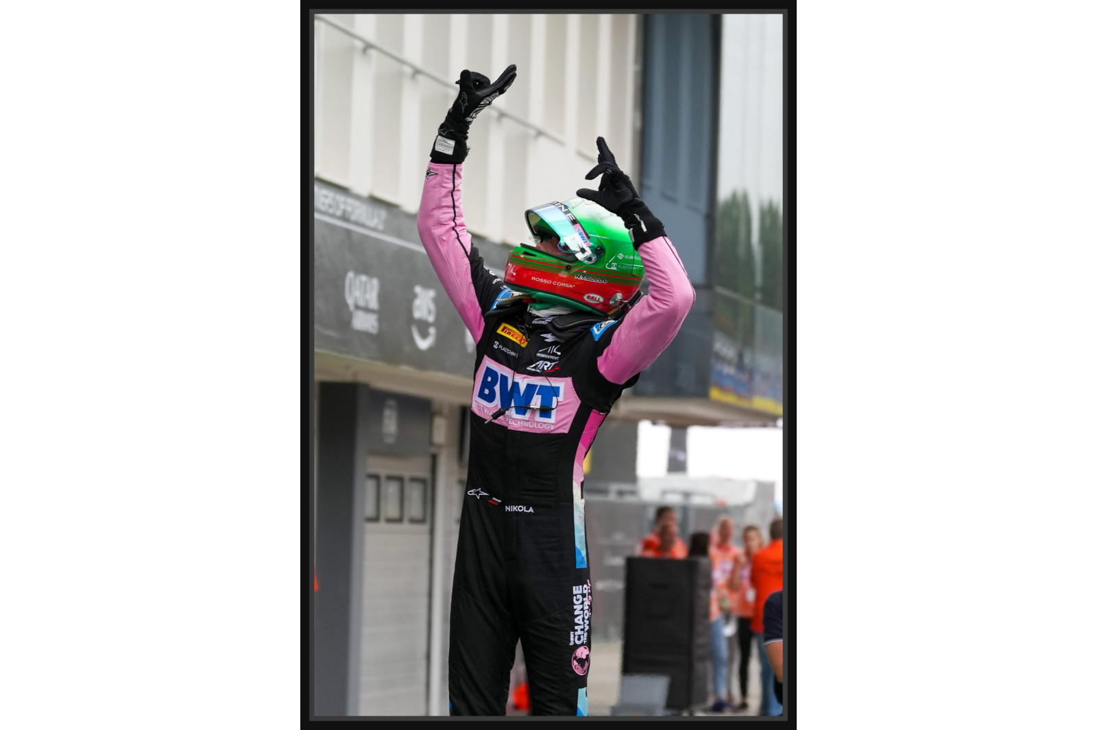 Пилот във Формула 3 празнува победата си, вдигайки ръце към небето. Снимката показва енергията и радостта от триумфа в моторните спортове, уловени в един незабравим момент.