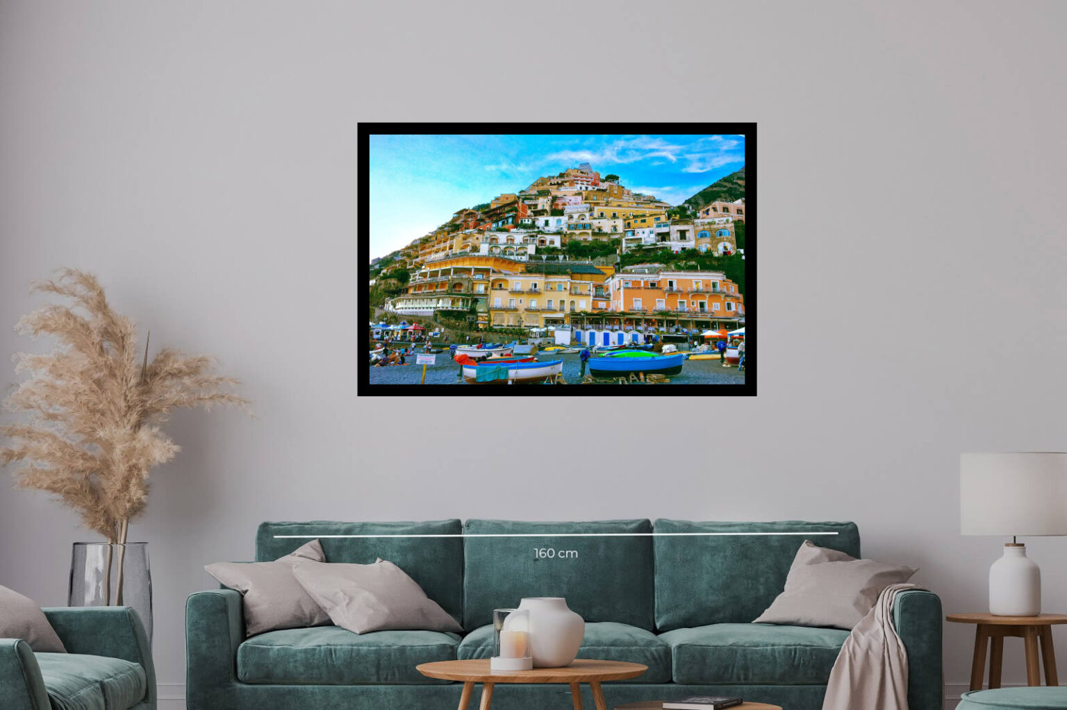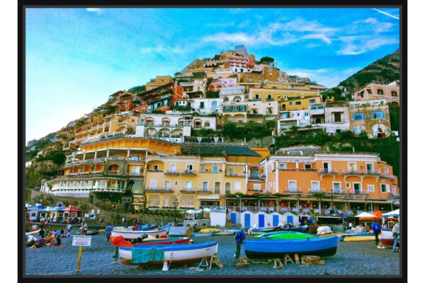 Фотография на красивото крайбрежно градче Позитано в Италия. Цветните къщи, издигащи се по склона, и оживеното крайбрежие с лодки създават неповторим южен чар. Изображението внася топлина, романтика и атмосфера на ваканция в интериора.