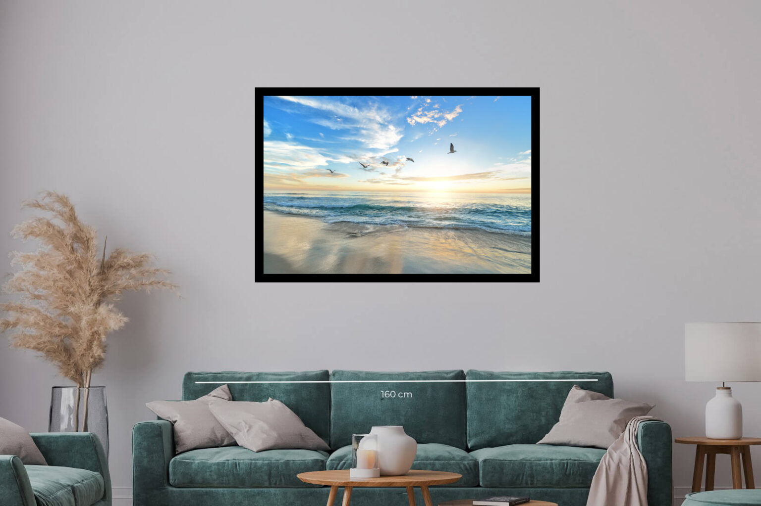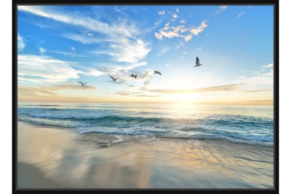 Снимка на морски бряг при изгрев със сияйно небе и ято птици, летящи над вълните. Контрастът между небето и водата създава драматична, но спокойна атмосфера.