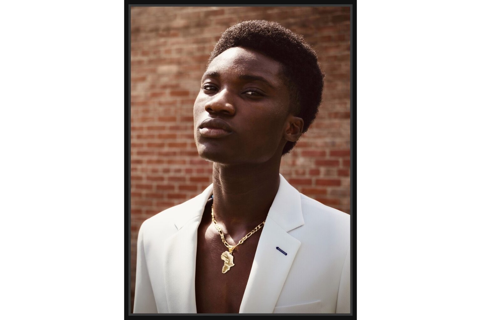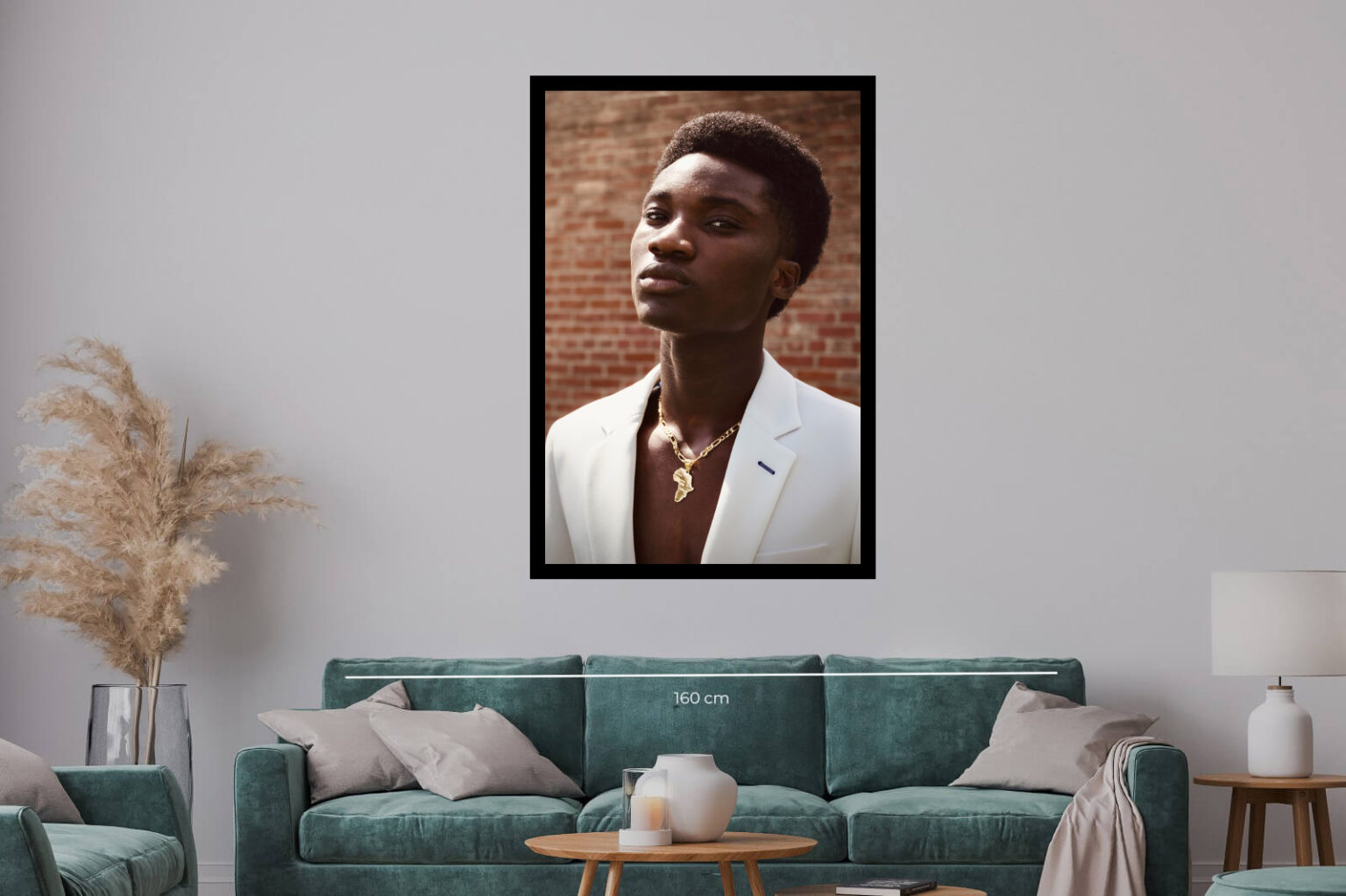 Елегантен портрет на млад мъж в бял костюм със златен ланец. Фонът е тухлена стена, която придава градска атмосфера.