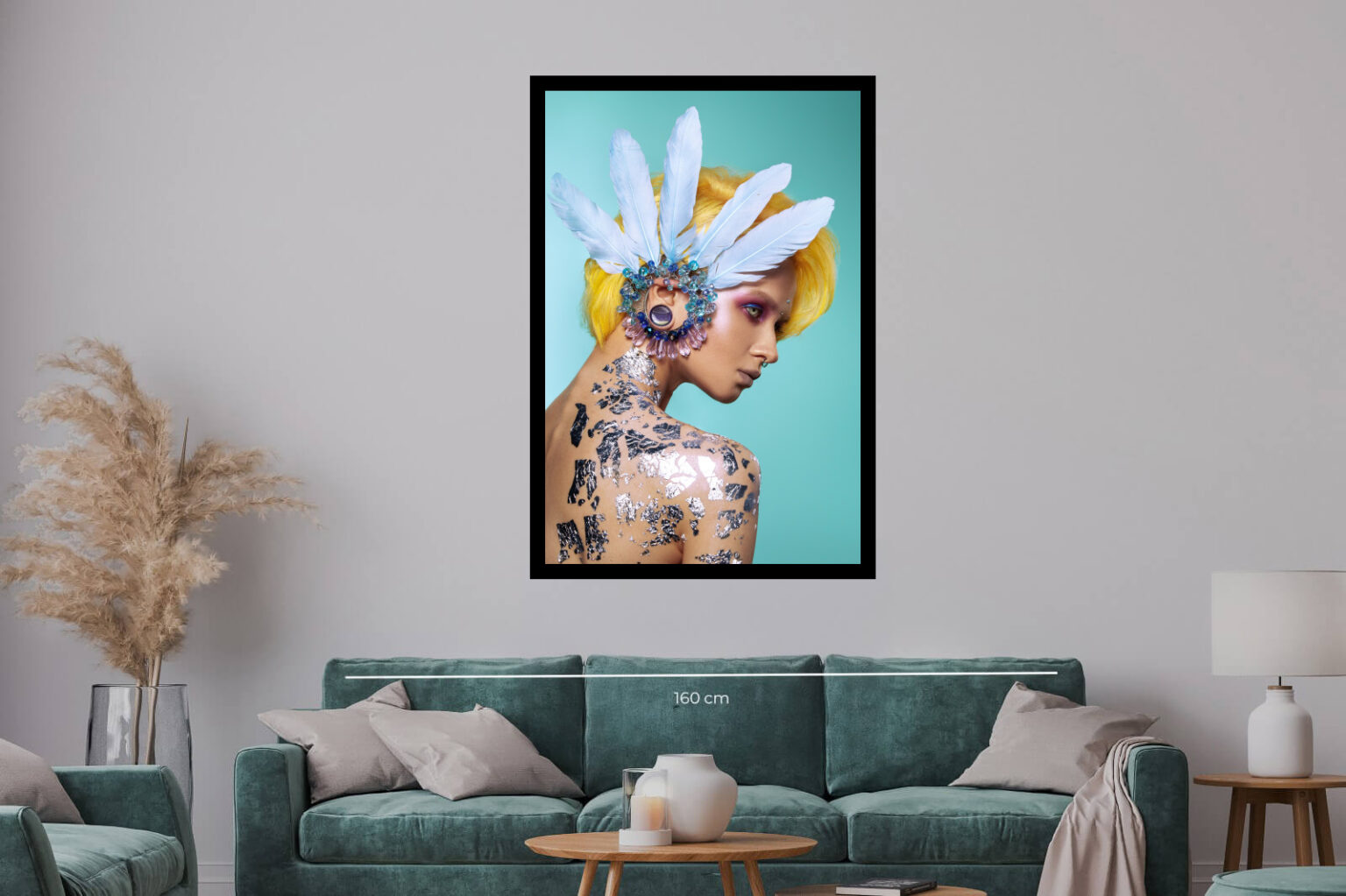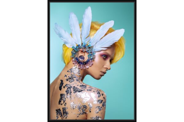 Модерен арт портрет на жена с ярка жълта коса, сини пера и сребърни декоративни елементи по кожата. Визия с футуристичен и авангарден стил.