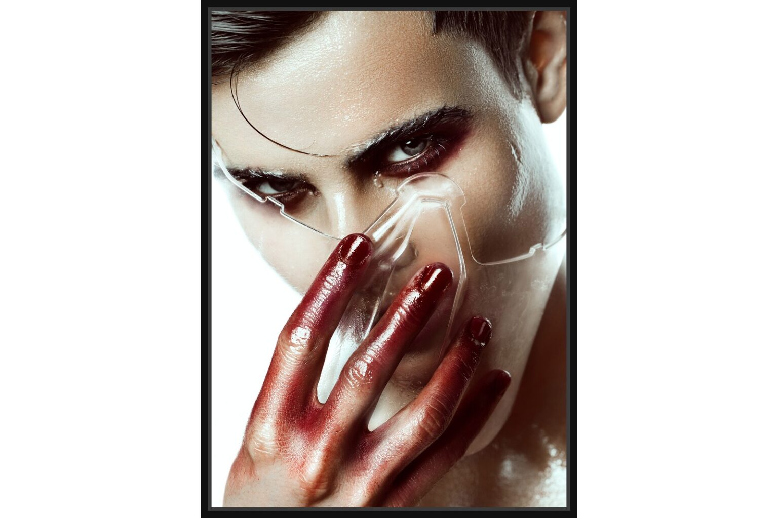Експресивен портрет на мъж с размацан червен грим по ръцете и лицето. Носи прозрачна маска, която придава драматичен ефект.