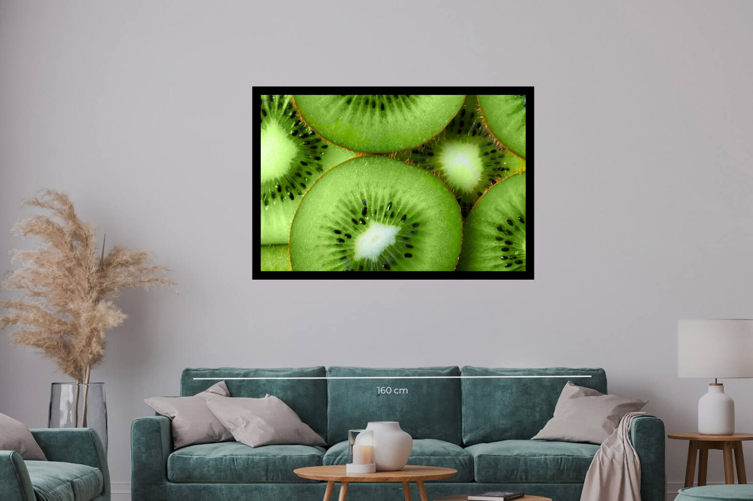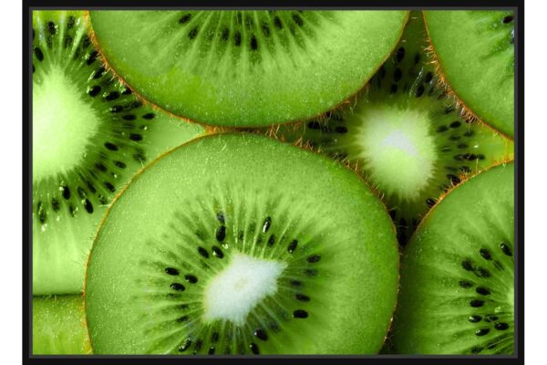 Крупен план на пресни резени киви, показващи наситения зелен цвят и детайлната текстура на плода. Снимката носи усещане за свежест и виталност.