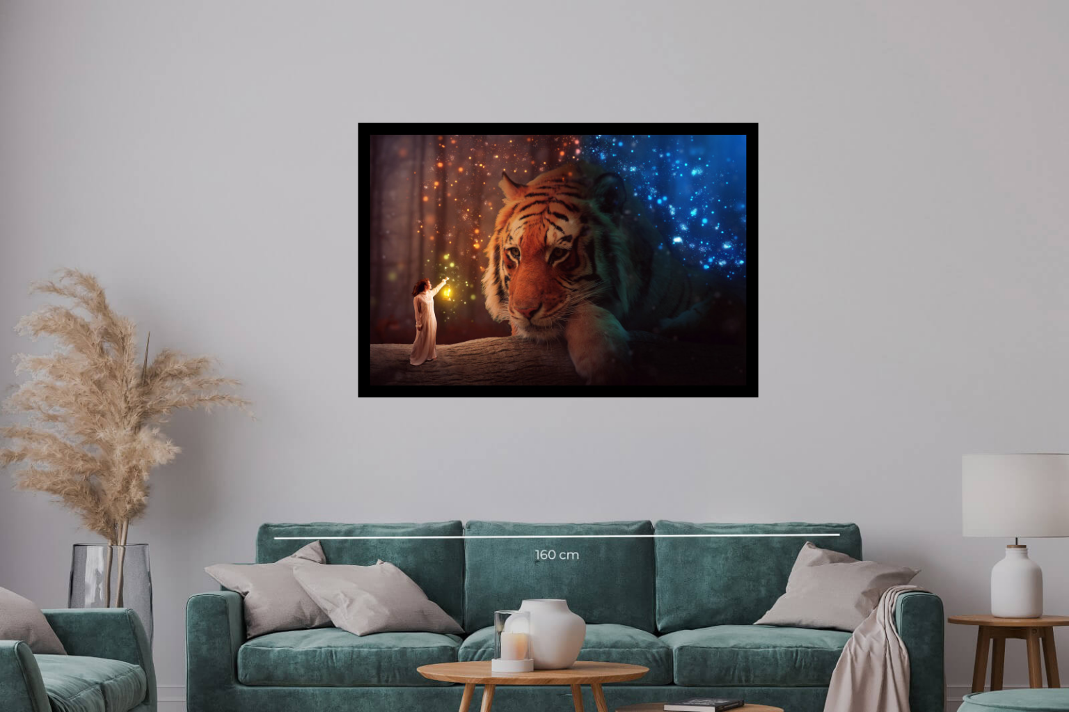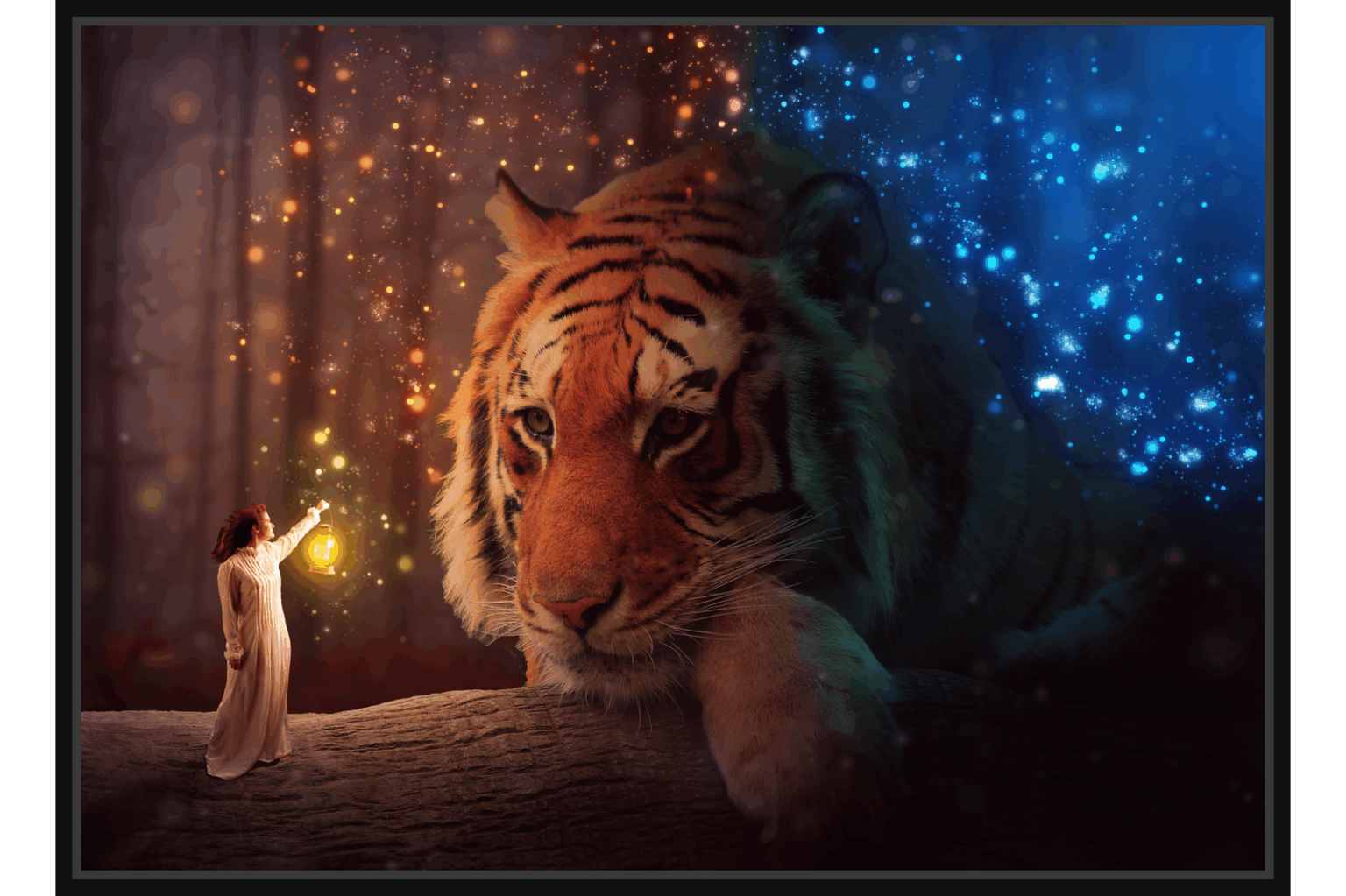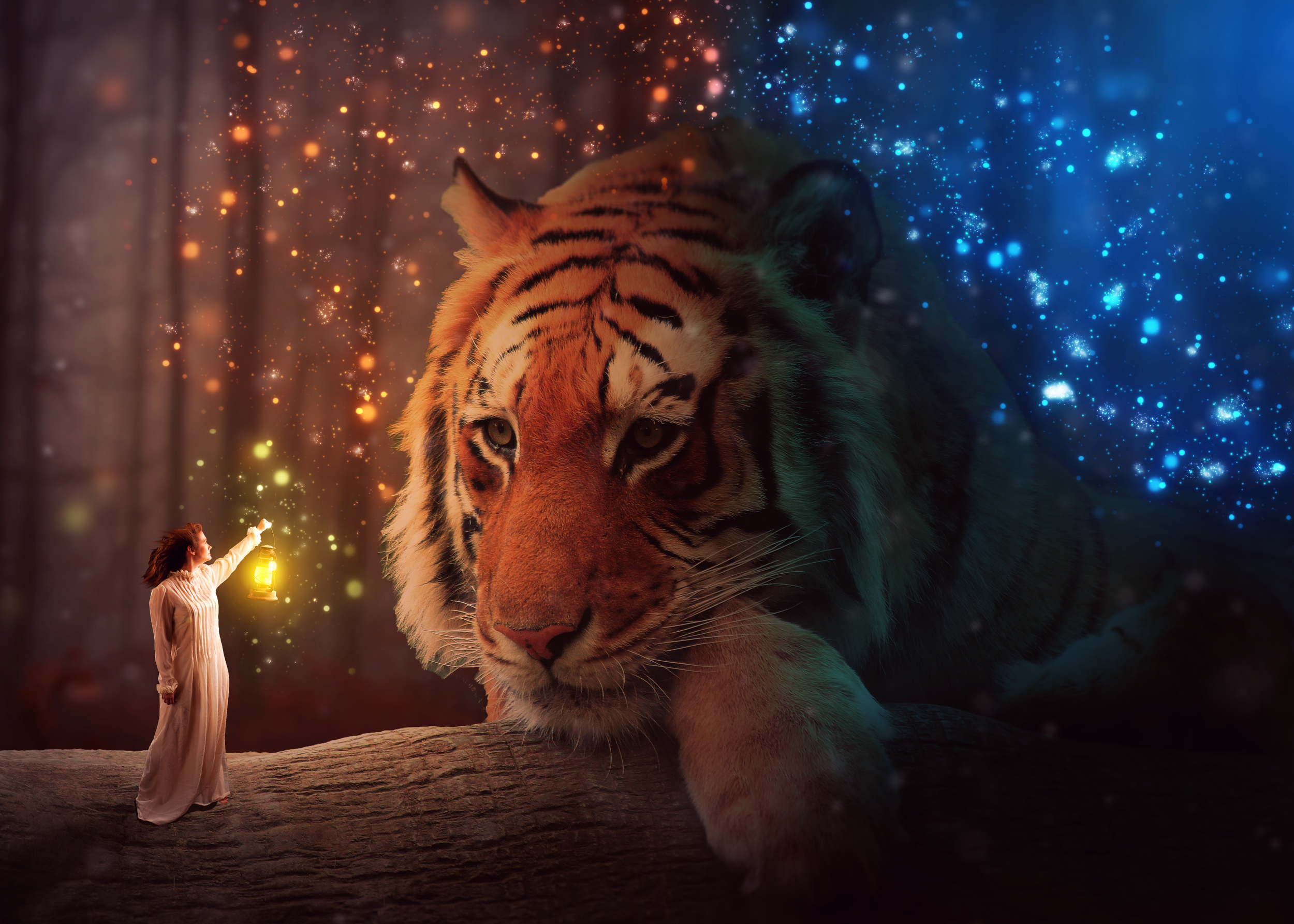Приказен тигър осветен от малка жена, носеща газов фенер.