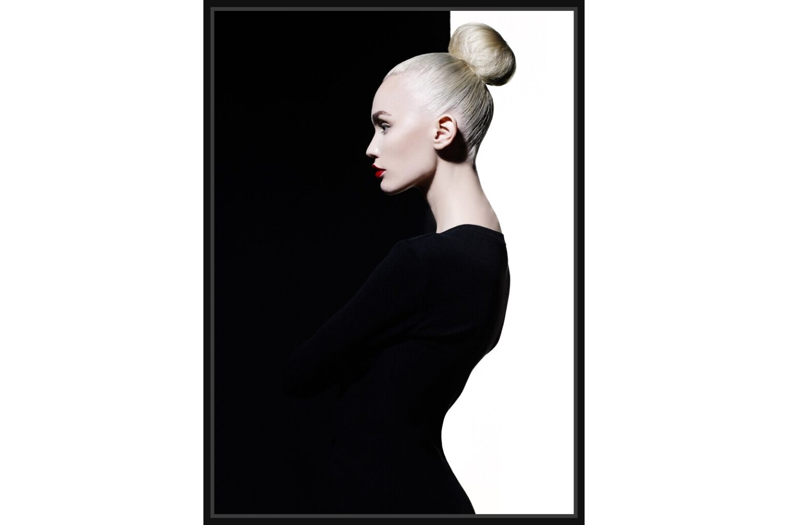 Минималистична черно-бяла фотография на жена в профил с прибрана руса коса и ярко червено червило. Стилен контраст между светлина и сянка с подчертана геометрия.