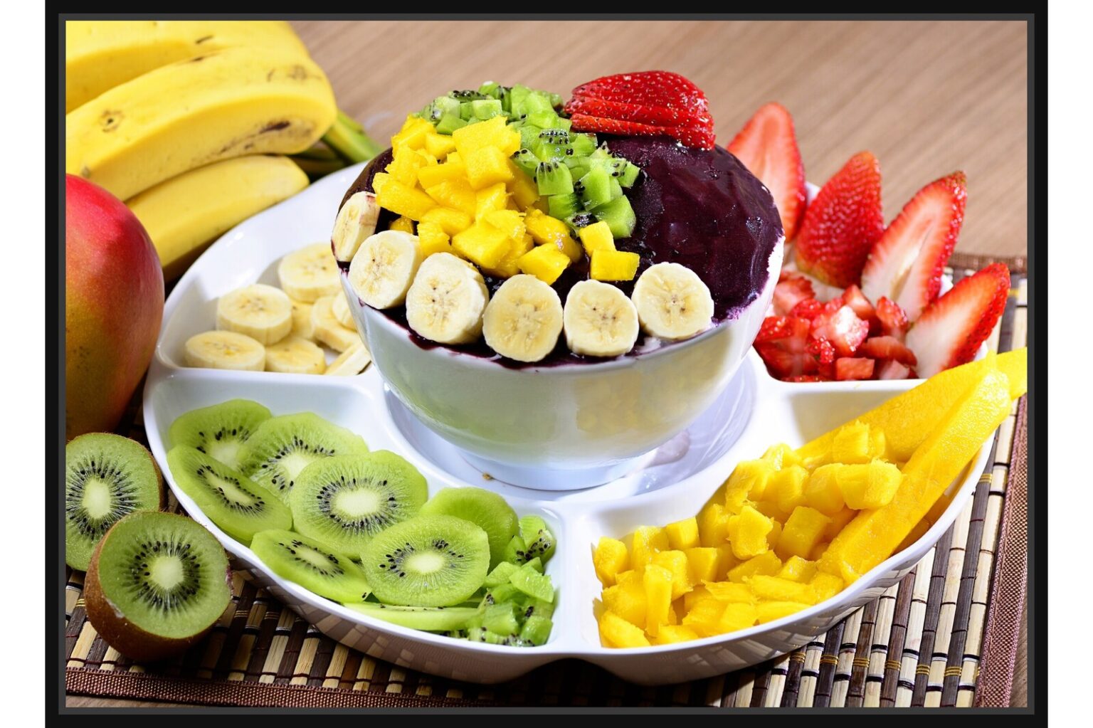 Свежа купа, изпълнена с разнообразие от плодове – банани, ягоди, киви и манго, подредени в хармонична композиция около кремообразна основа. Цветните нюанси създават усещане за свежест и здравословен начин на живот.
