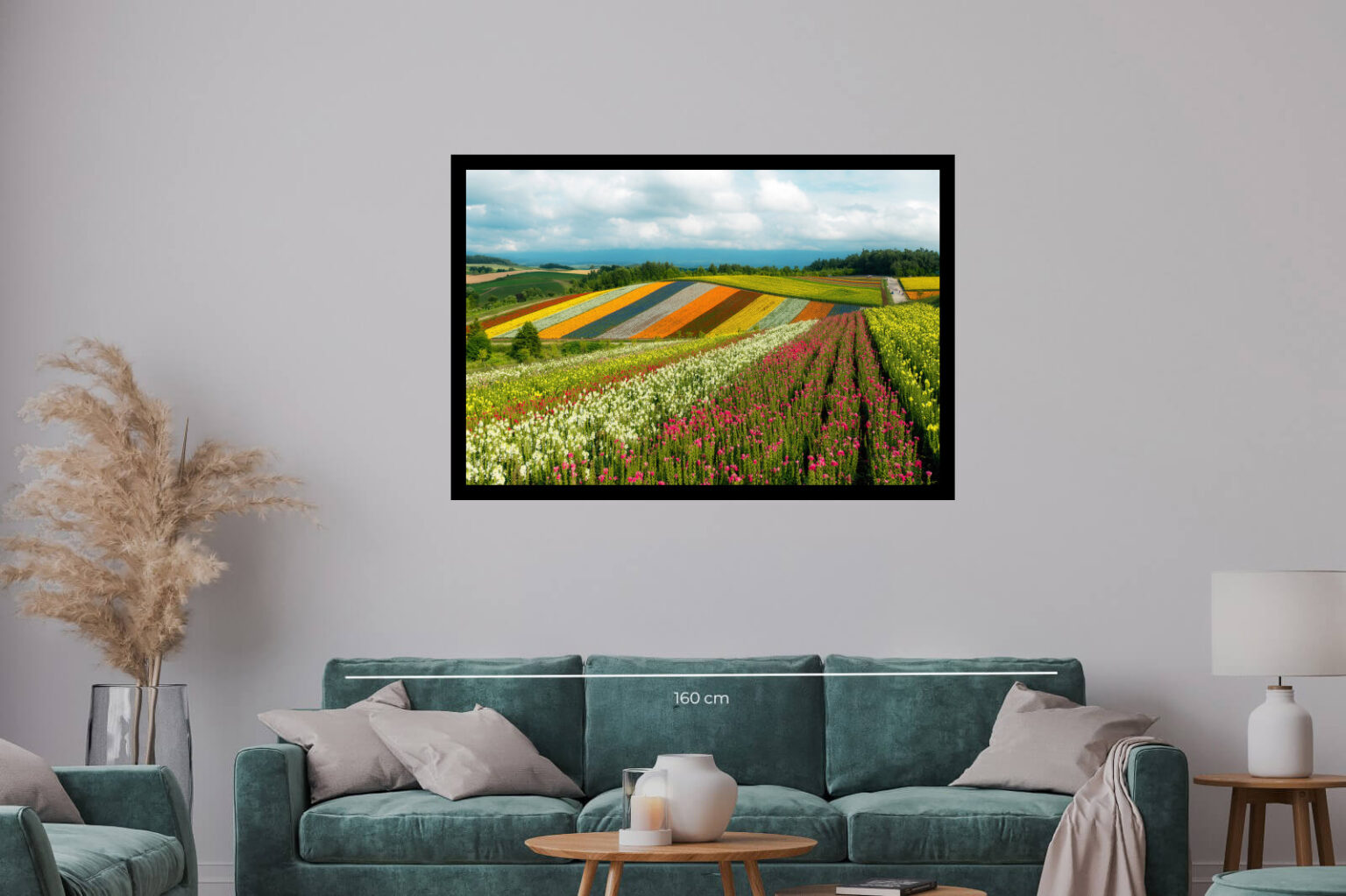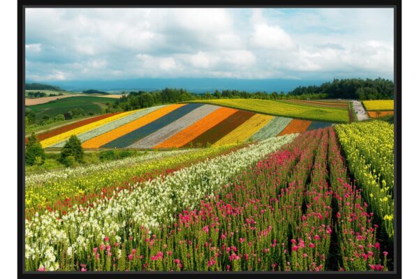 Широка цветна поляна с редици от различни цветове – розово, жълто, бяло и оранжево. Величествен и цветен пейзаж, който излъчва радост и енергия.