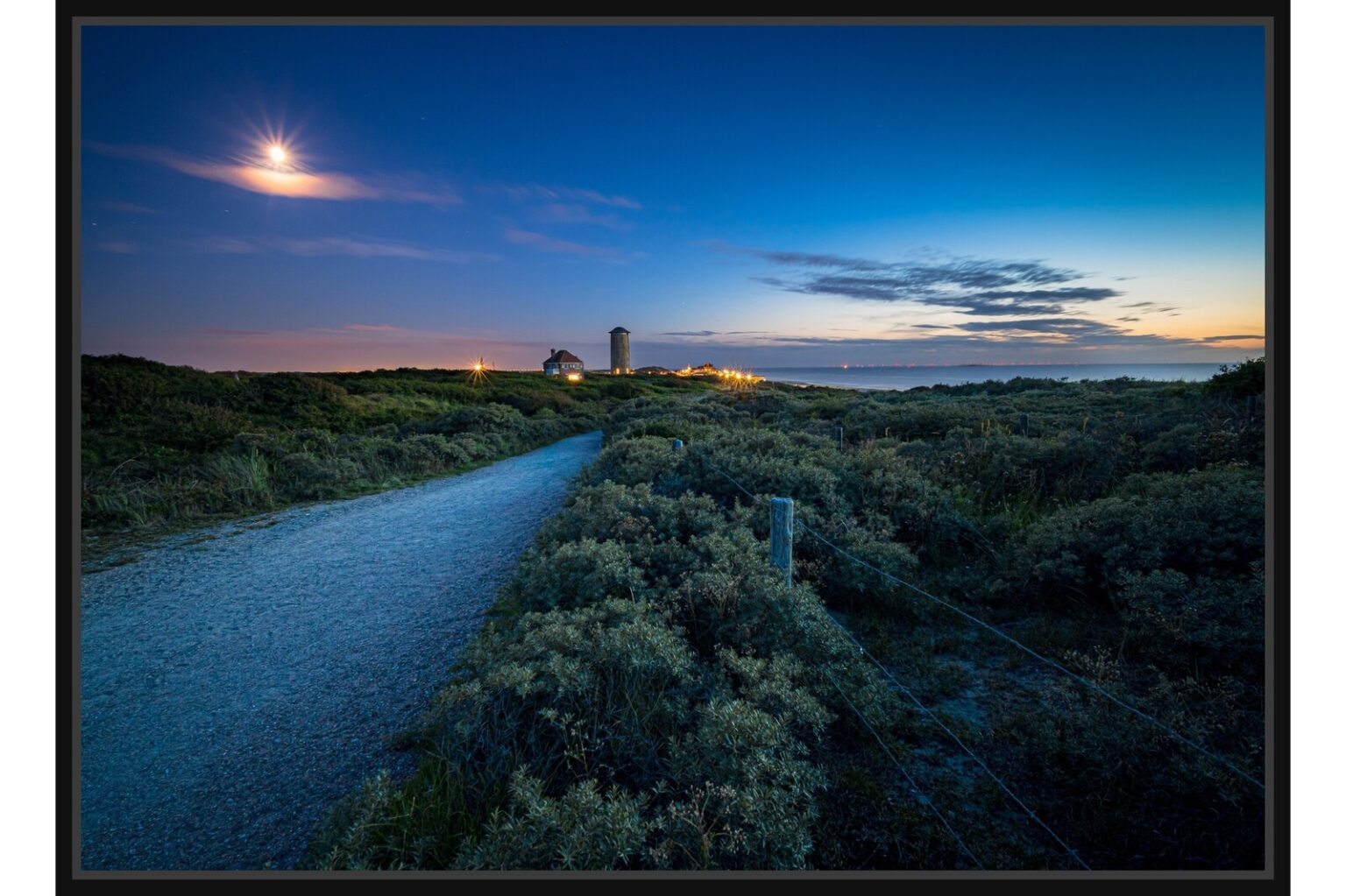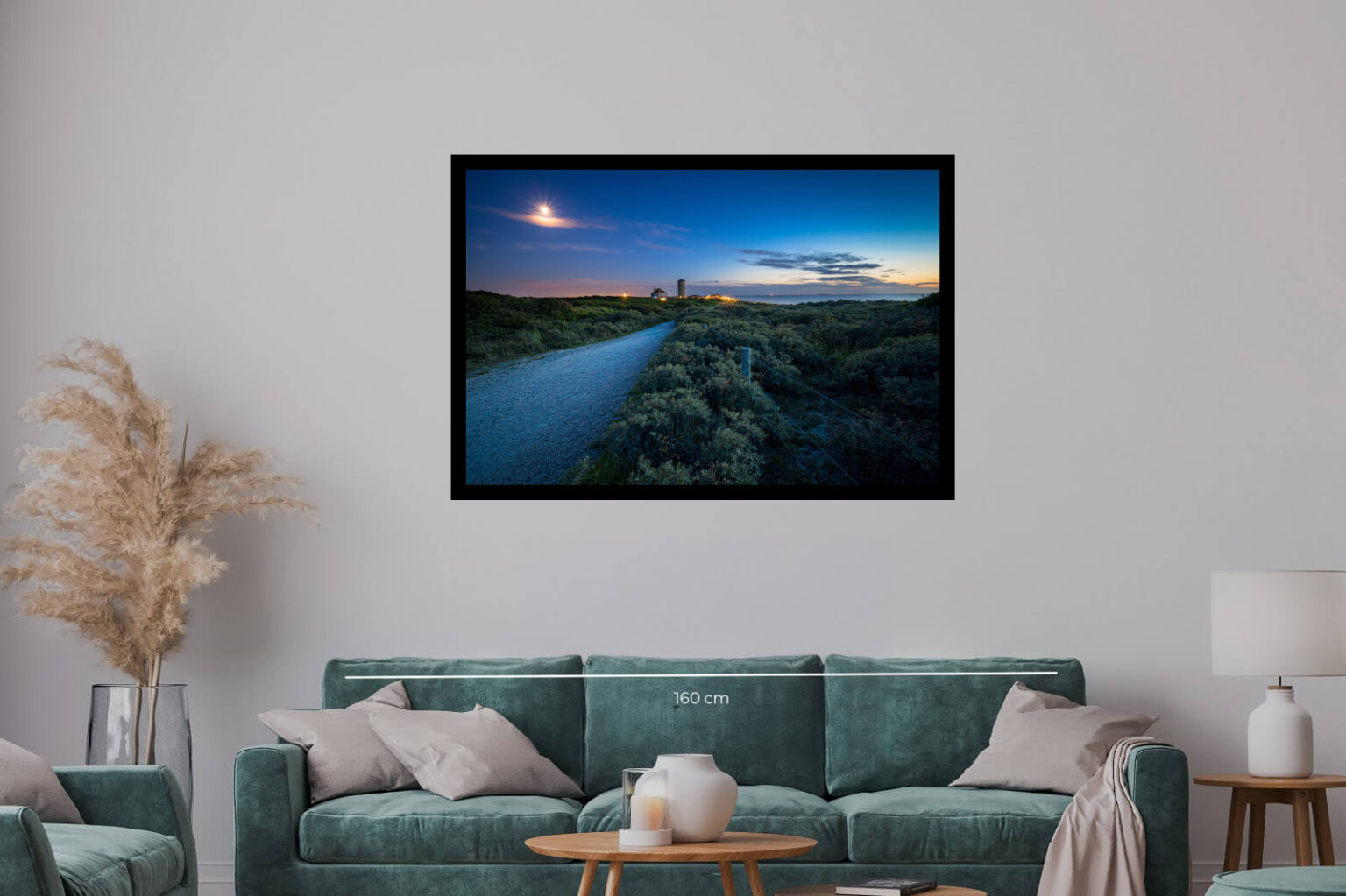 Спокойна нощна сцена с осветен път и далечен фар, обгърнати от меката светлина на луната. Атмосферата носи усещане за тишина и загадъчност.